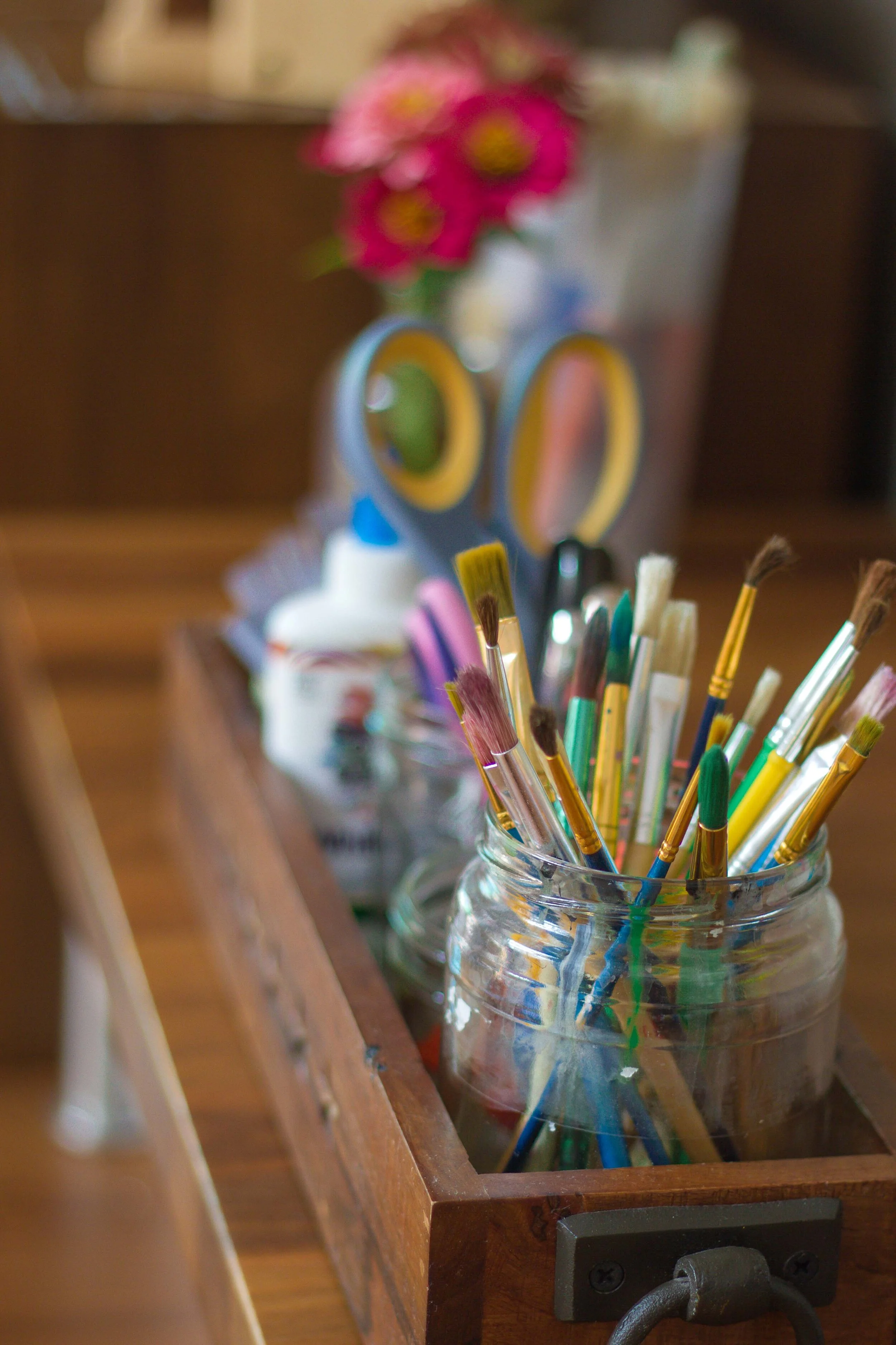 Art supplies can get cluttered and unruly if they aren’t tamed. Keep them neatly organized. I keep glass jars from jams and sauces which are great for holding pens and pencils, markers and scissors. Inside the storage drawers, silverware organizers hold other tools while all of the materials are sorted by type and are organized KonMari-style using empty cardboard boxes as dividers within the drawers.