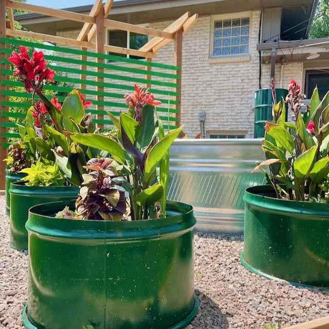 I wanted large planters filled with plants to surround the pool, but large planters are expensive. So I bought some 55 gallon barrels (food grade) on the Facebook Marketplace. They were $16 each, and we made two planters from each barrel. I painted them each a deep green, and filled them with tropical plants!