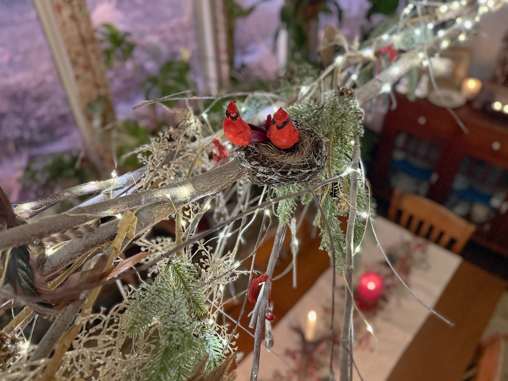 Crystal ornaments from a trip to Ireland, birds, and glass icicles that are older than my marriage.