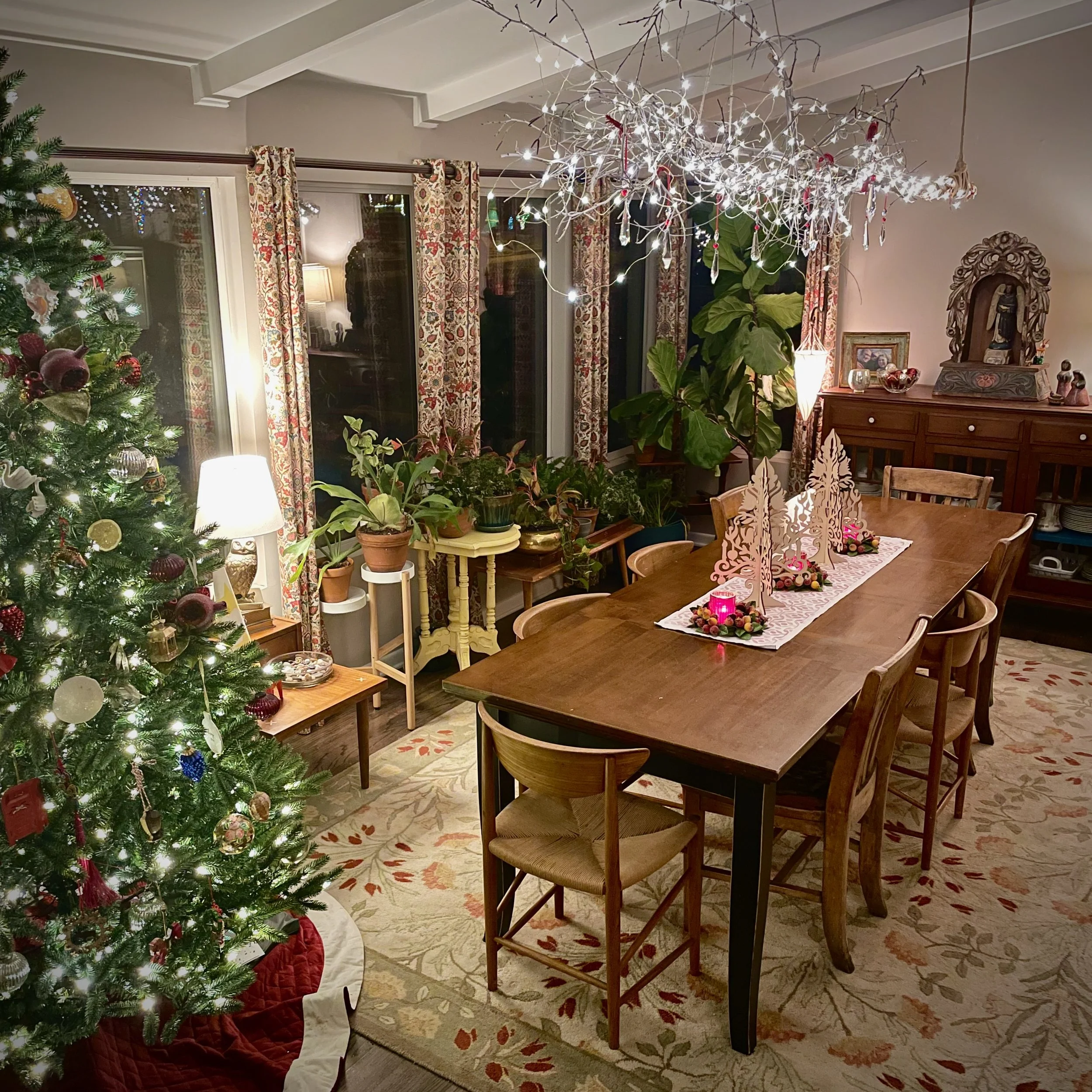 Our dining room set for the holiday season. The branch chandelier is a fun place to decorate for each season and gets adorned regularly. Currently: birds and crystals.