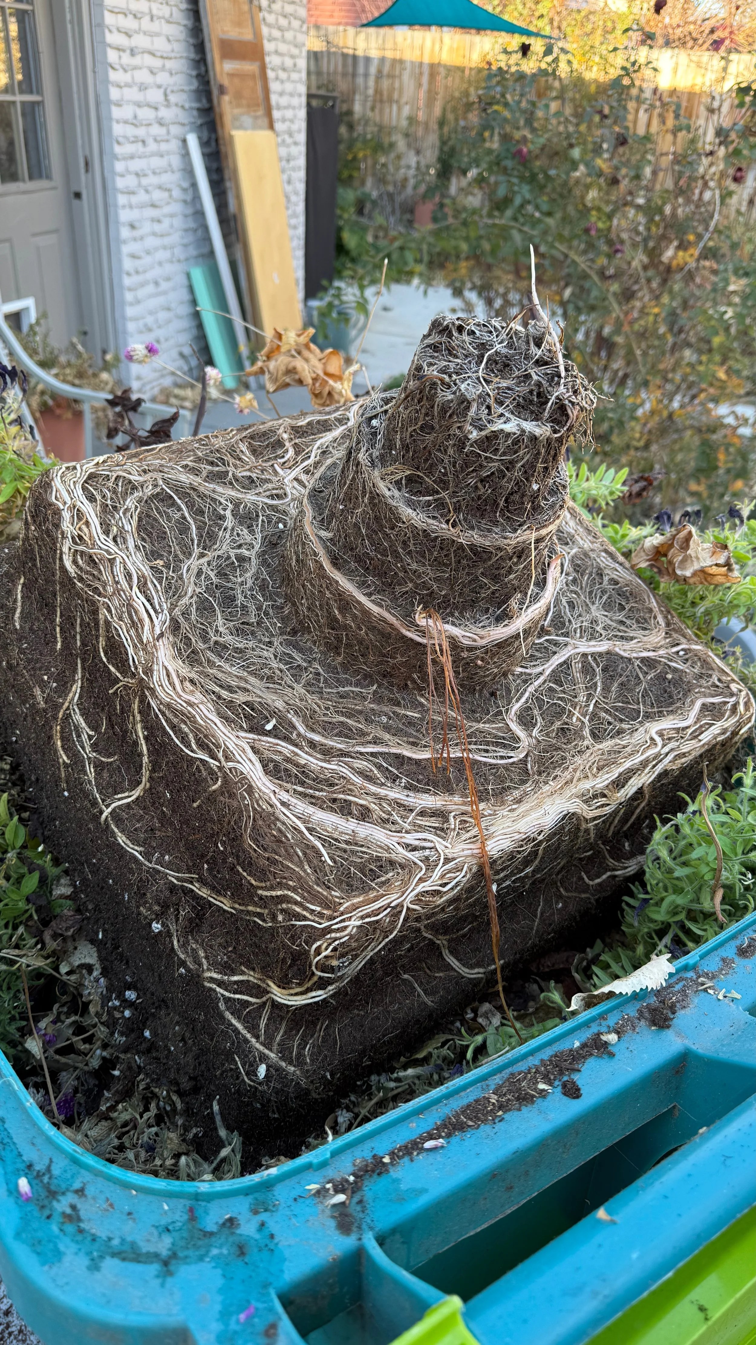After our first hard freeze I emptied my TruDrop planters, rinsed them, and stowed them for the winter. This is what the roots looked like when I pulled them out! Wow!