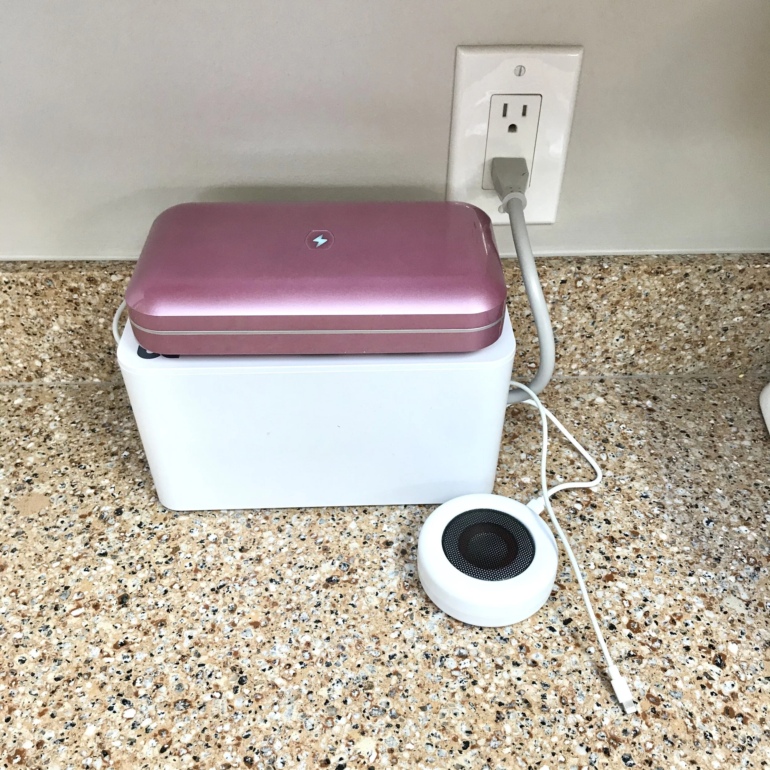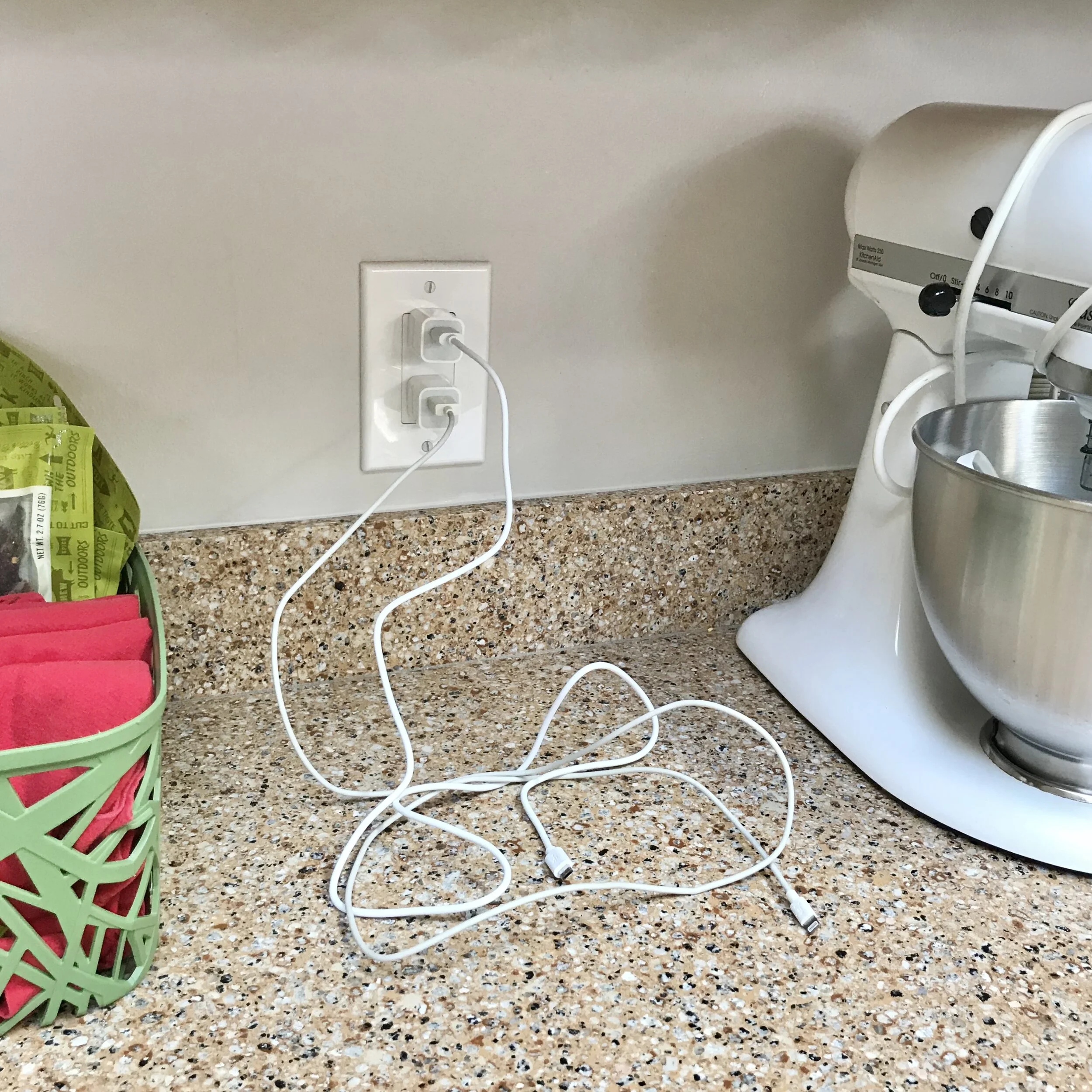 With the installation of the CableBox Mini, we created an electronics command center. Now our PhoneSoap sanitizer sits on top for the whole family to use. Phone chargers peek out discretely. And our all-important cooking speaker is always in its spot. And we have regained an outlet for the mixer or other appliances.