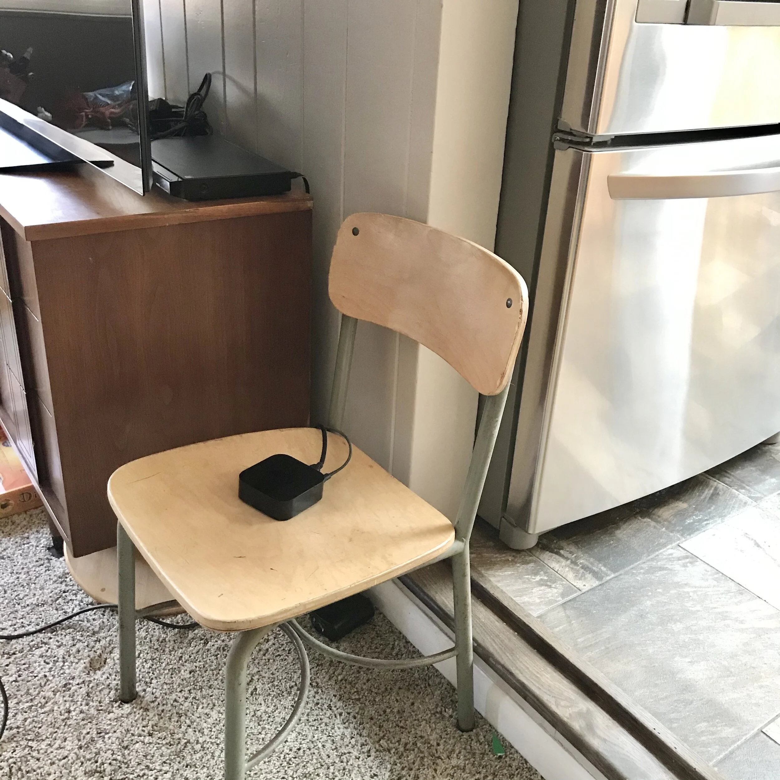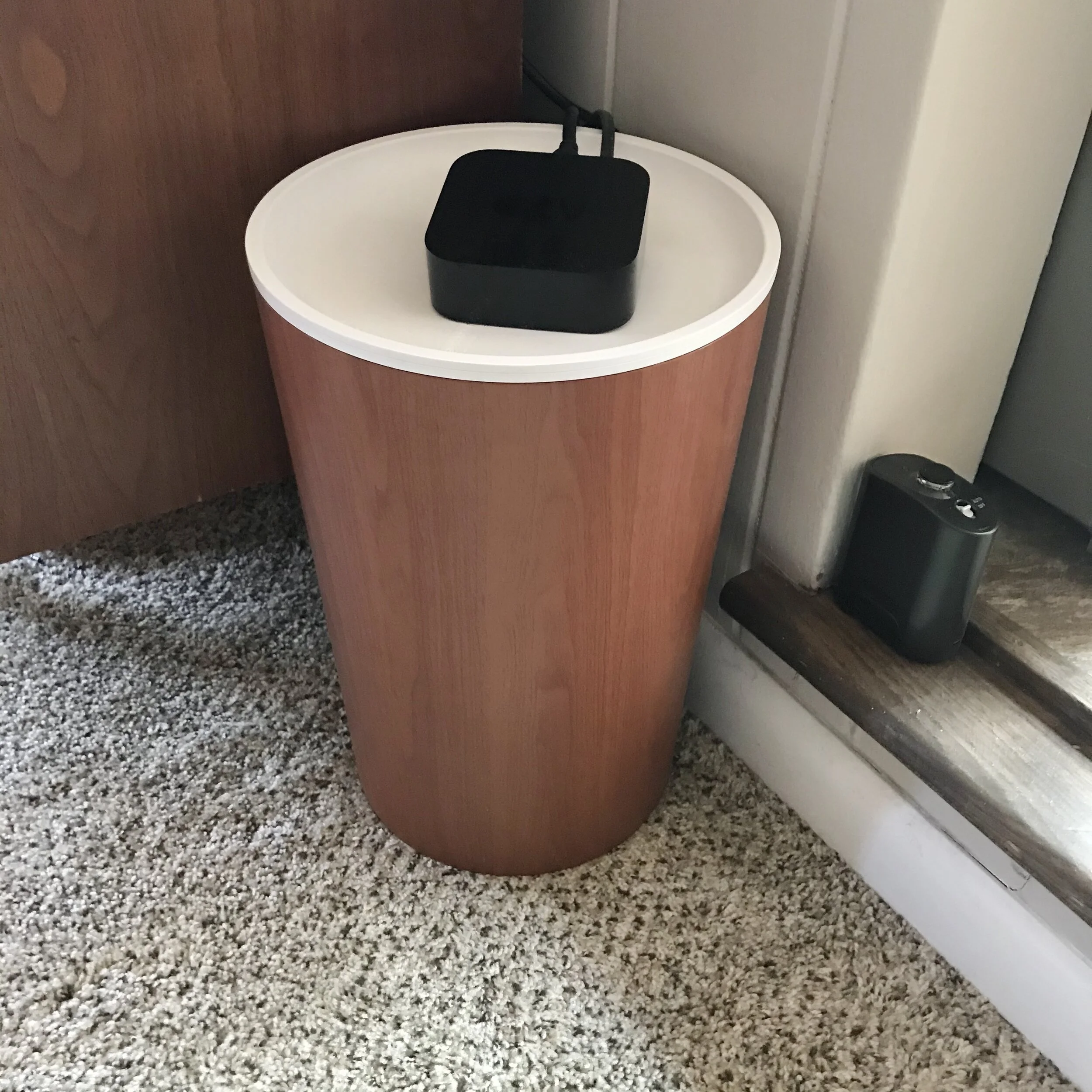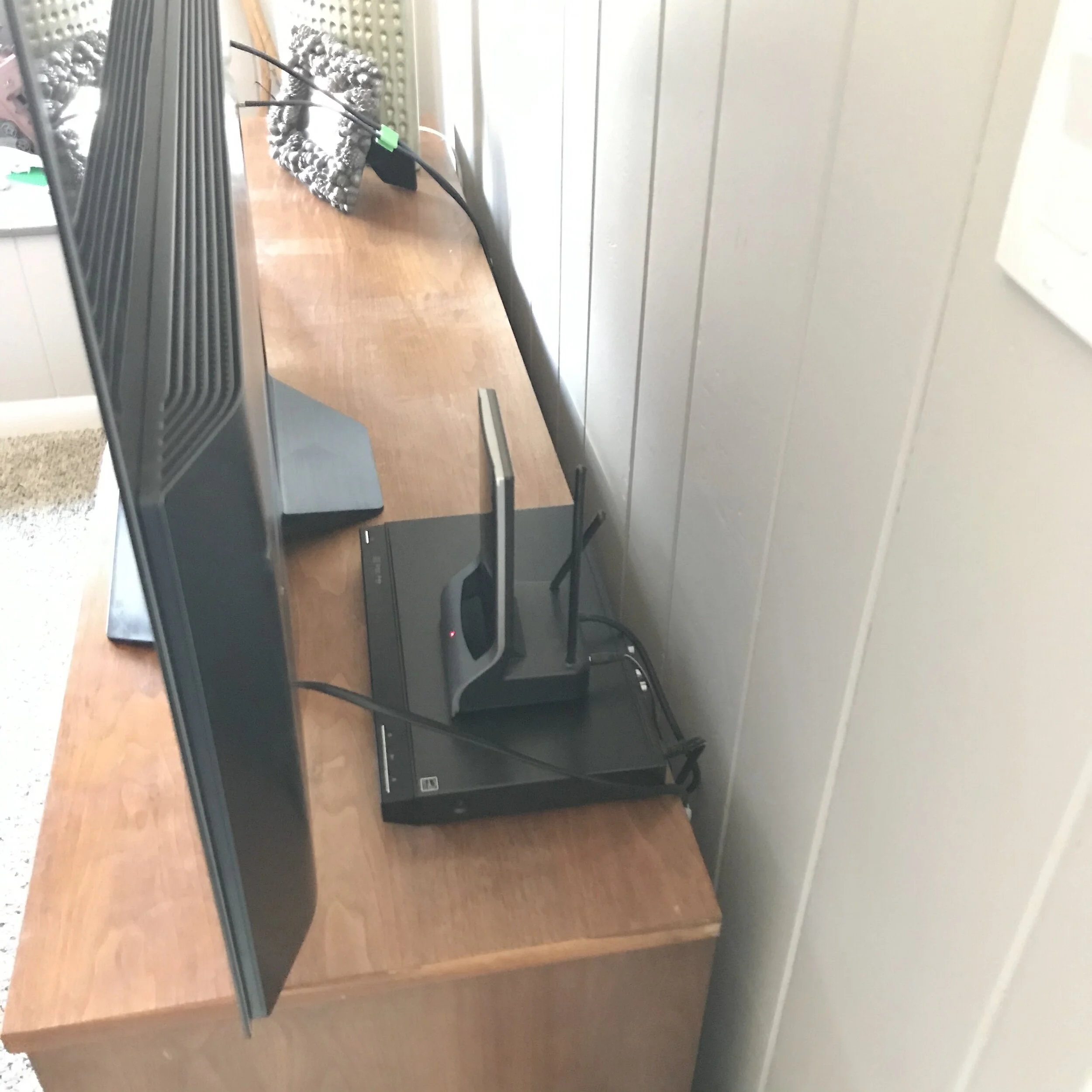 Yep. It was a mess. A power strip, a DVD player, and an antenna. Yuck. Additionally, our Apple TV had to sit on a chair next to the entertainment center. That’s a long story — the fridge blocks the internet signal — but the chair was an unsightly solution. We still needed a place to put the Apple TV, but it needed to be more attractive and less in the way.