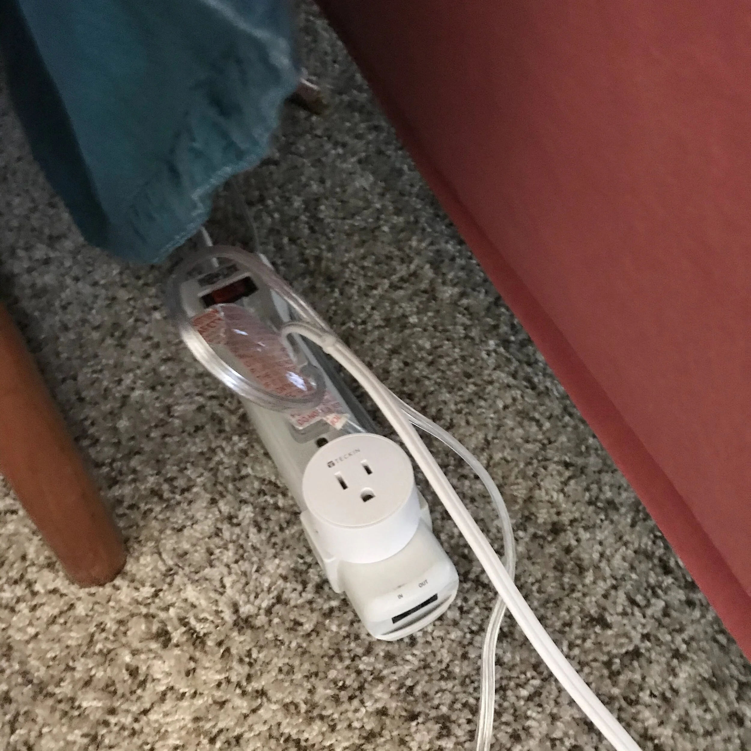 Our couch sits in the middle of the living room. Great for flow. Not so great when all of the outlets are on the walls. Our temporary solution was a power strip behind the couch — unsightly but practical. This was the first place Ole decided to do some serious chewing, so it was one of the first places we needed some serious puppy-proofing.