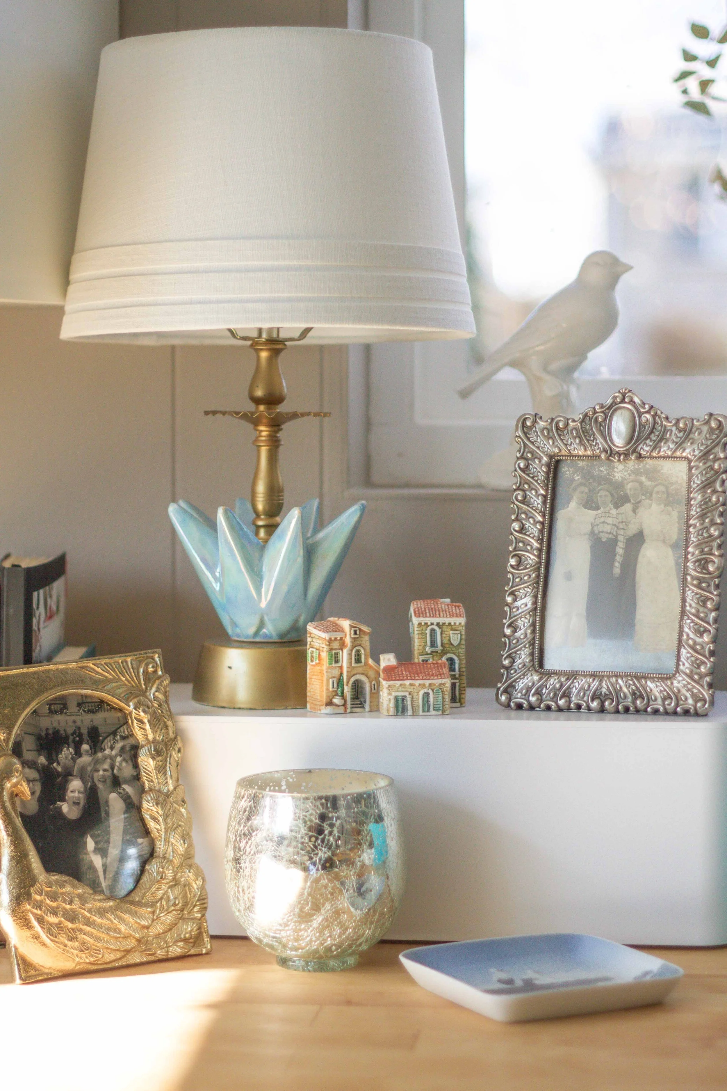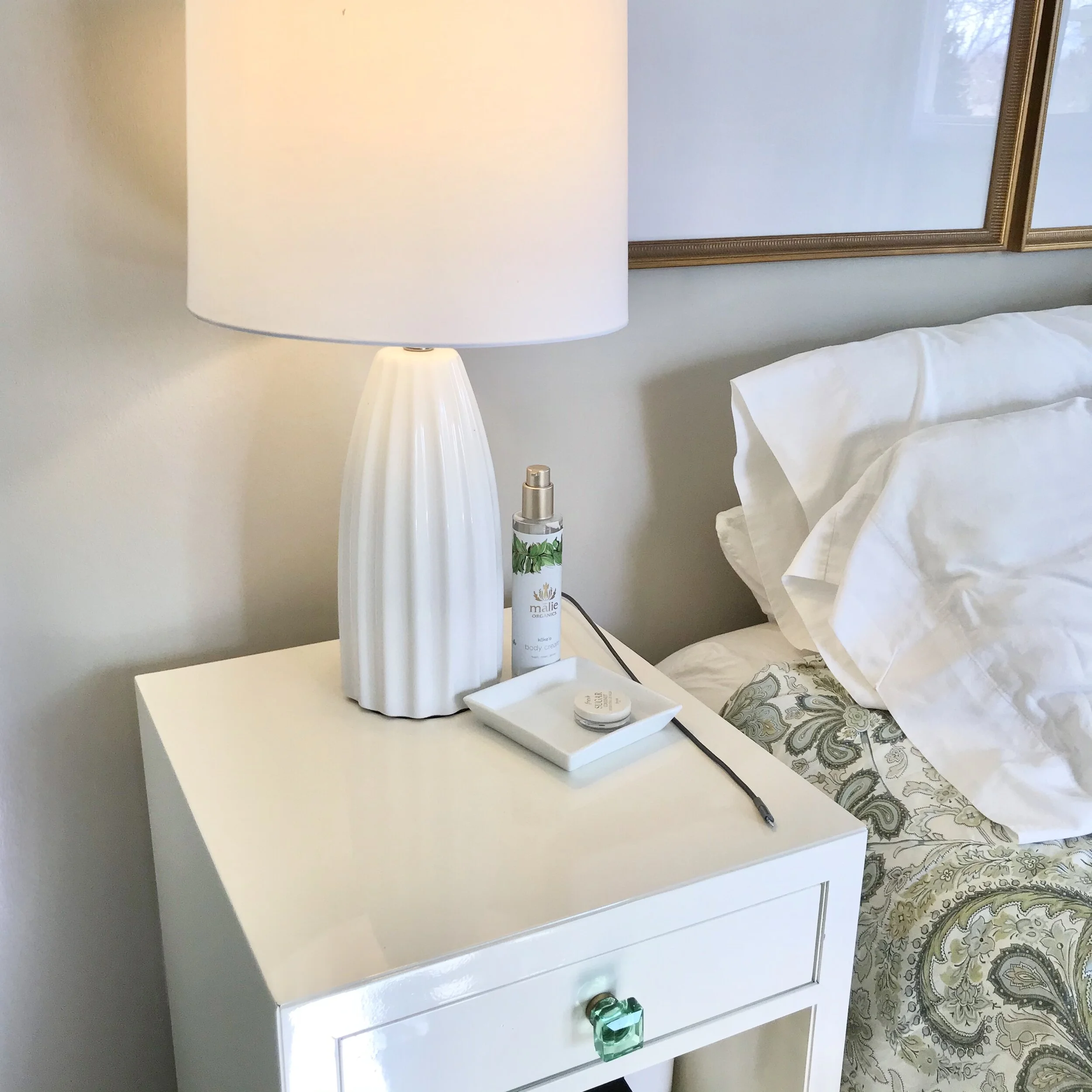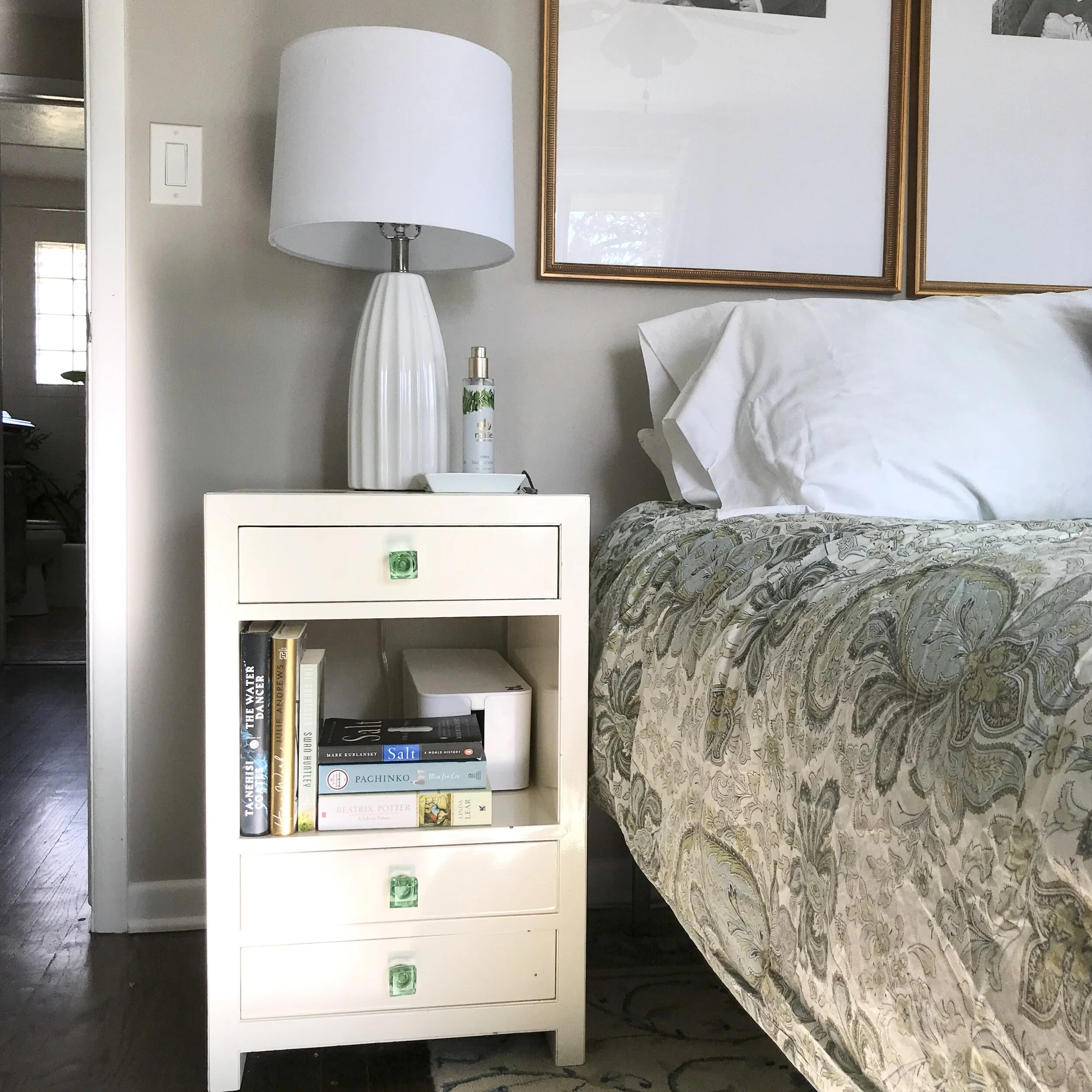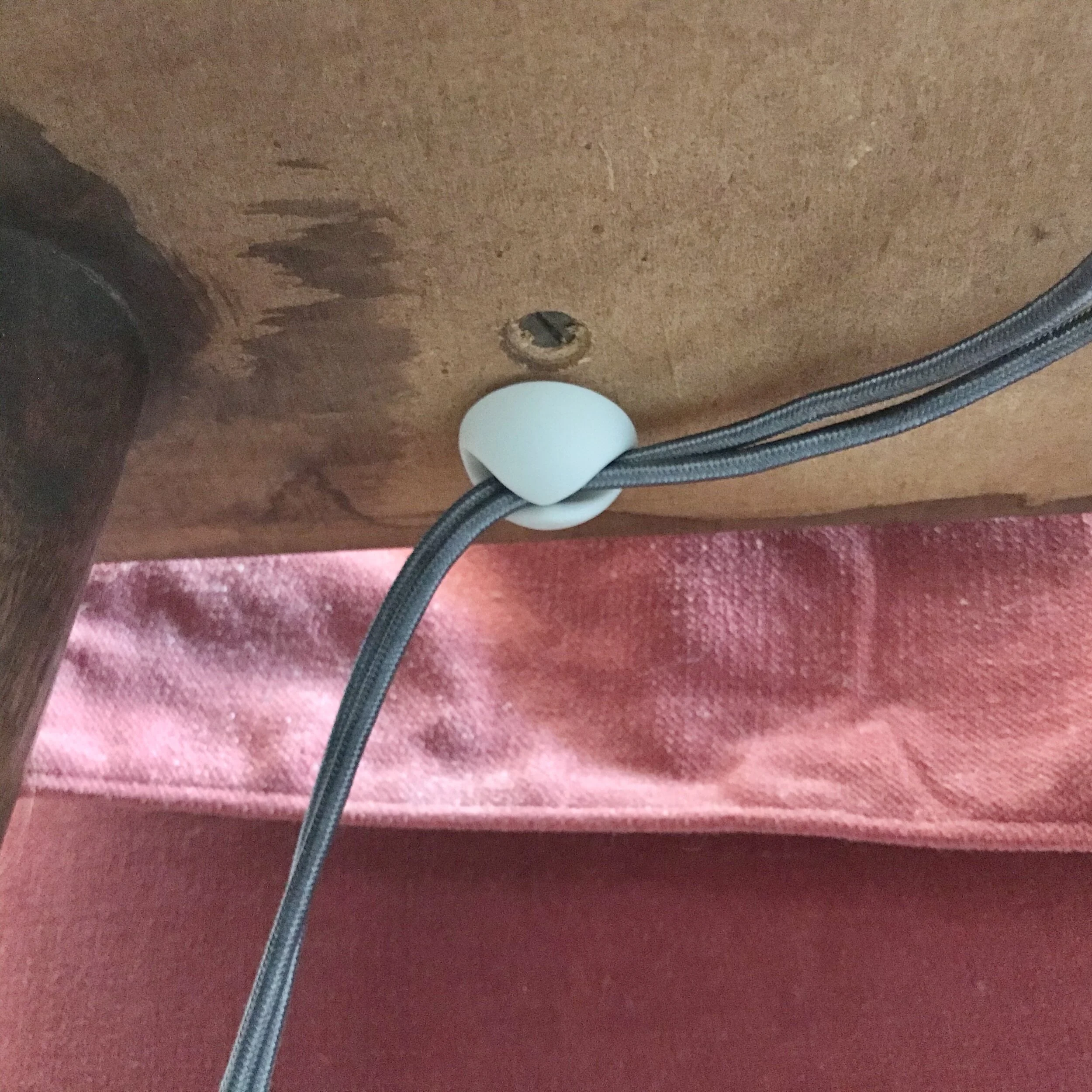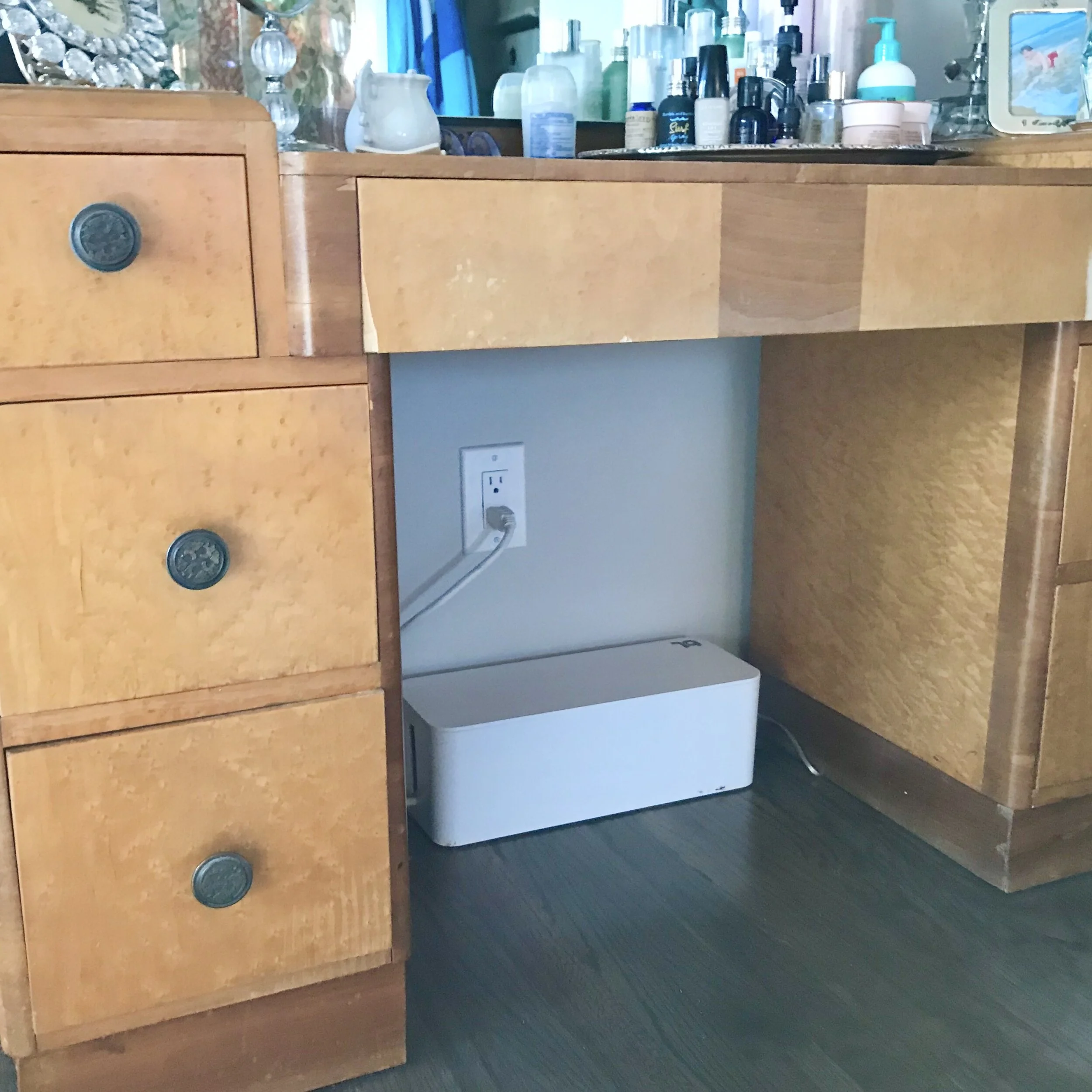 I have also deployed CableBoxes and other solutions in each of our bedrooms. In Bambino’s room we had a mess of plugs for lamps, the aquarium, and a variety of other electronics which needed to be corralled. Now it is neat and tidy, plus the CableBox which I used creates a platform for his jars of treasures. At each of the bedside tables in our master bedroom, CableBoxes hide a power strip into which lamps and phone chargers are plugged. I also used CableDrops to snake the charging cables up onto the top of the bedside table. They stay in place, always at the ready, and we never have to hunt for the chargers. At my dressing table, I also have a CableBox for another power strip. Here I plug in my lamps as well as a hairdryer and any curling irons, etc, that I may need.