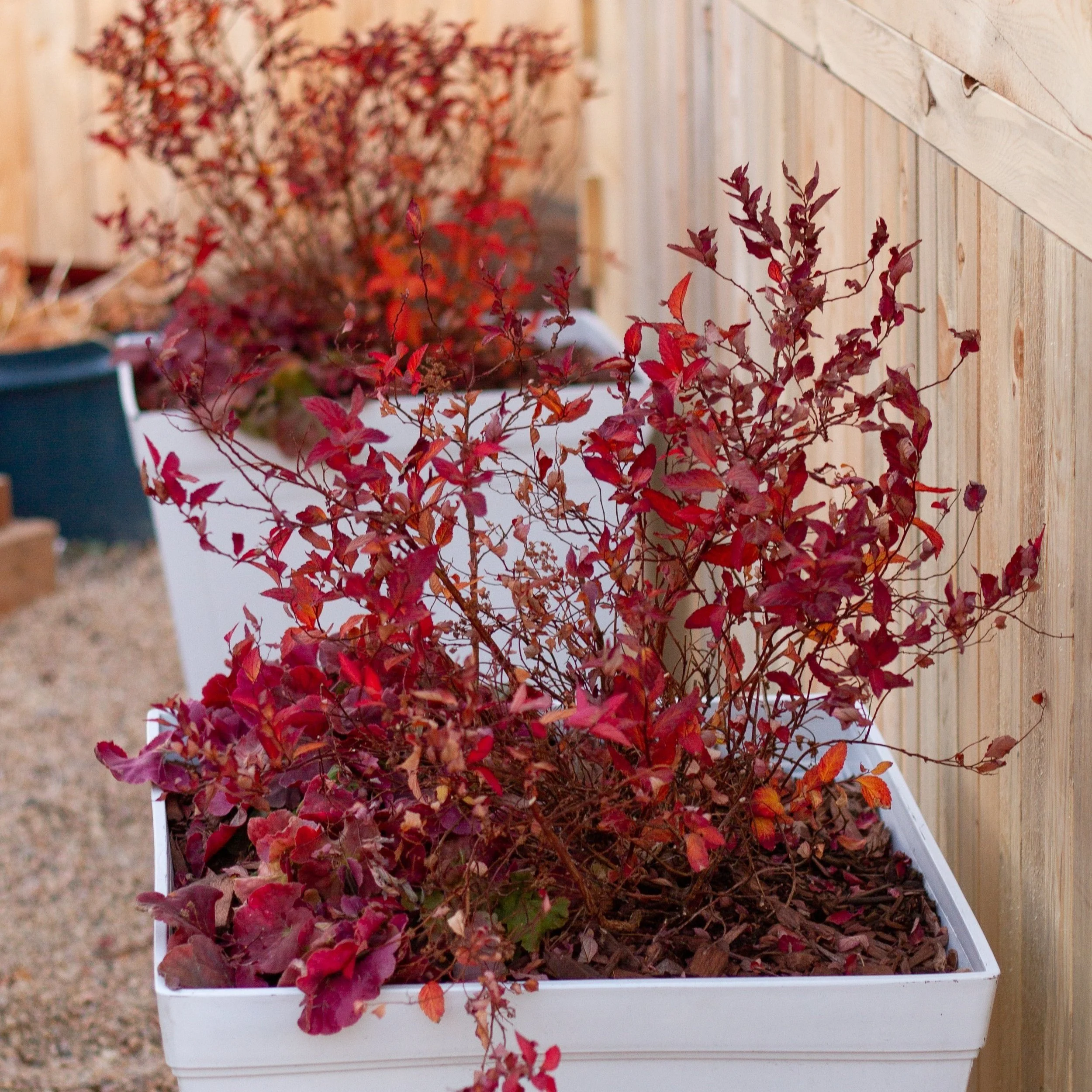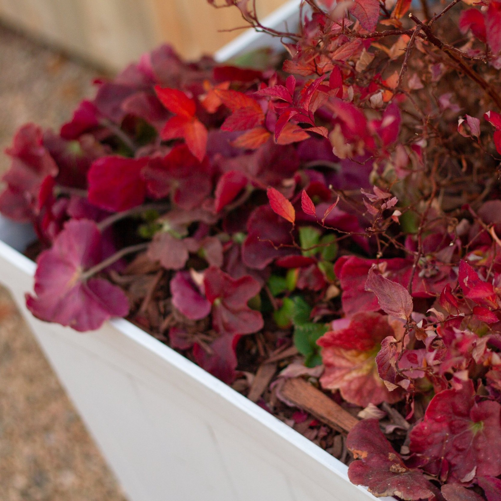 Underplantings of strawberries and Heuchera have long-lasting red color well into December beneath these dwarf Burning Bush.