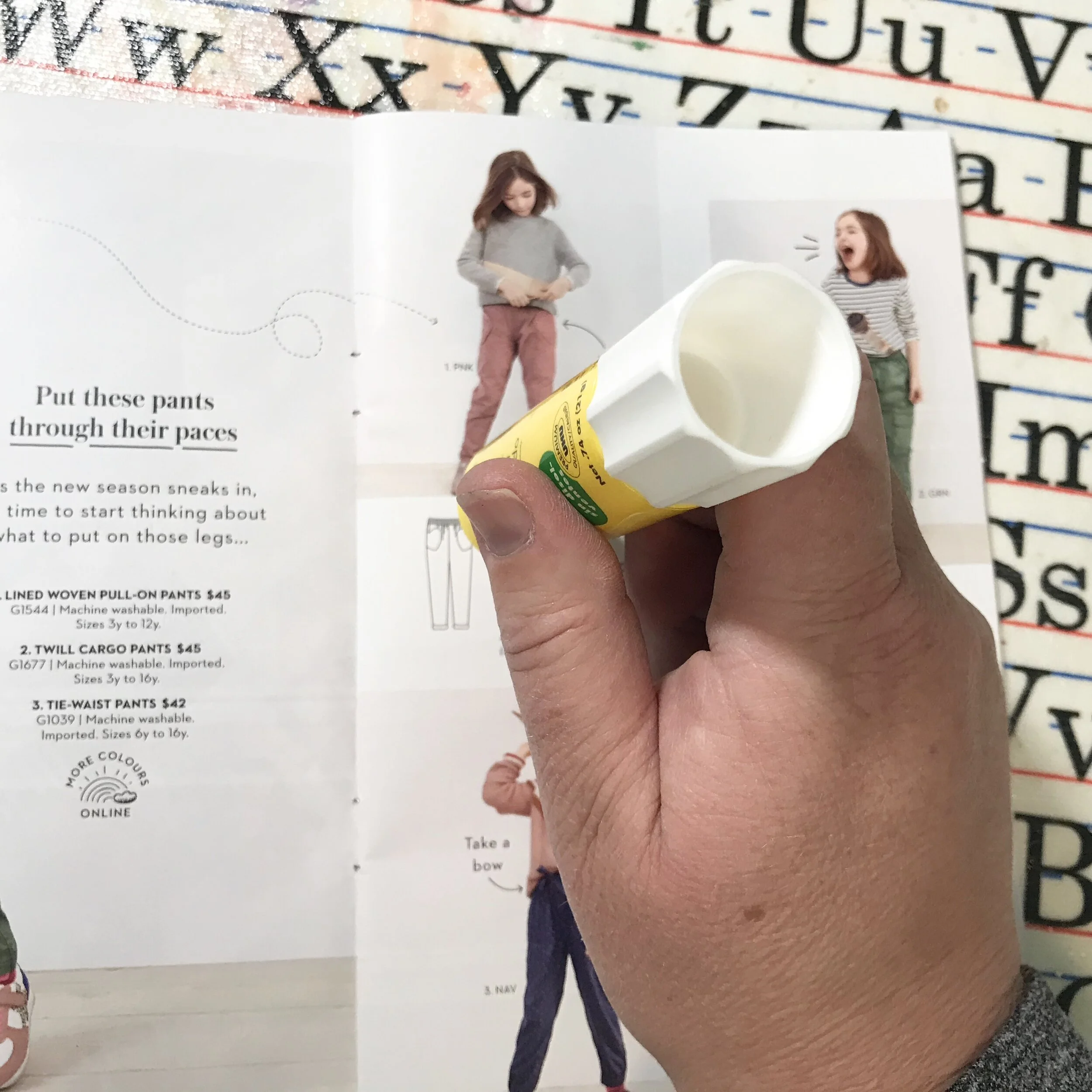 If you choose to use a glue stick, the paper will wrinkle. Be sure you use a brayer to smooth out each page after gluing. Most of the wrinkles will disappear once the glue has dried.