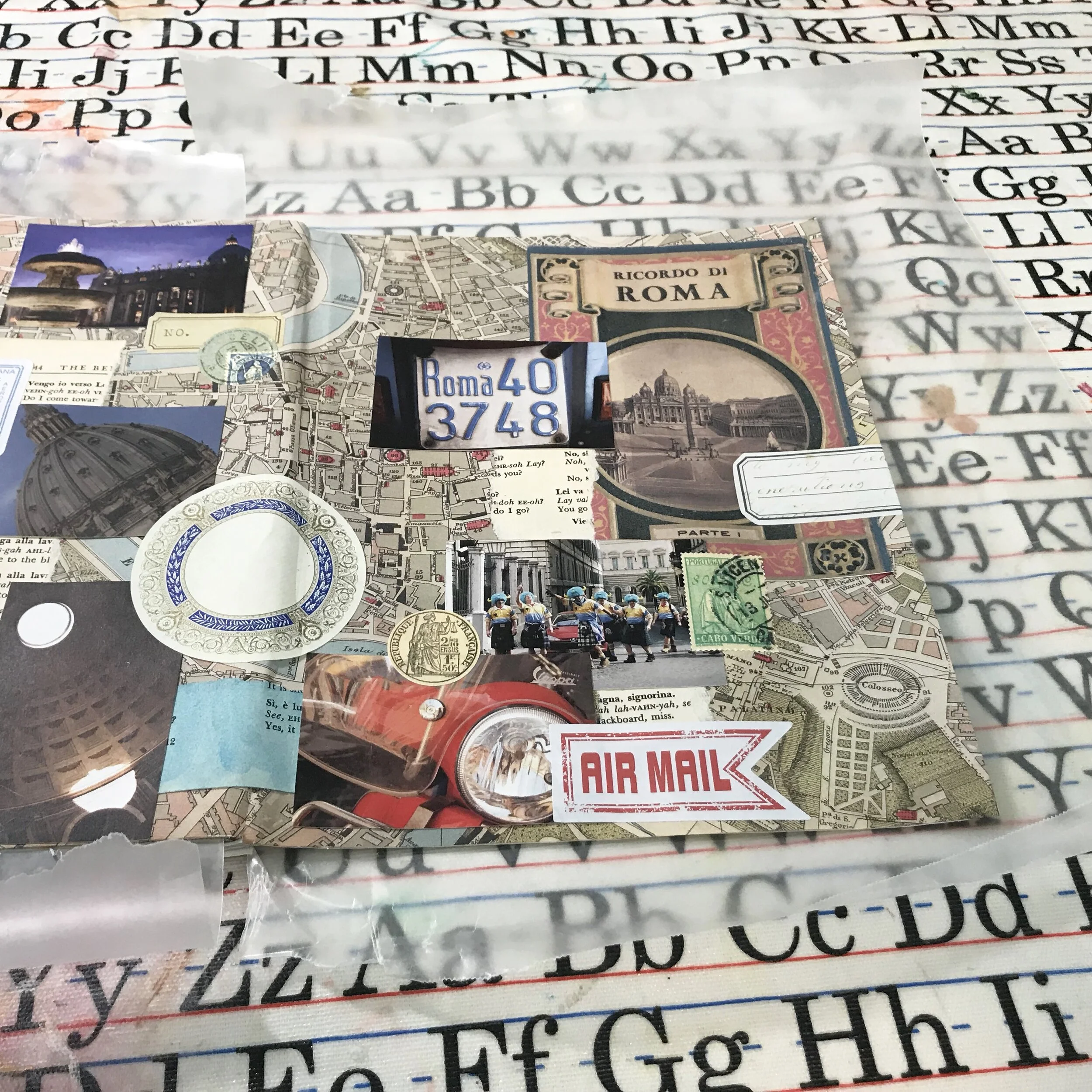 Using whatever medium you desire, decorate the front cover. I’m partial to collage, so I used ephemera, photographs, stickers, pages from an old book, and more to cover my journal’s front cover.