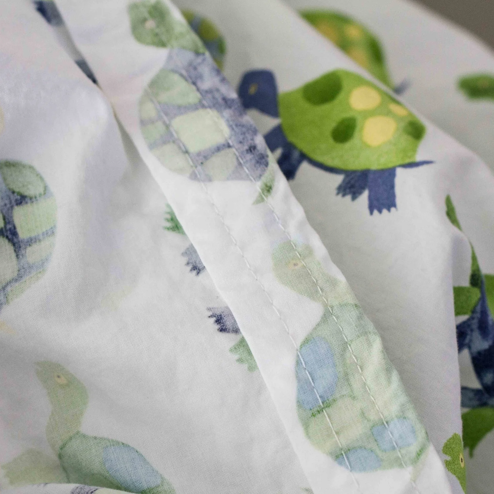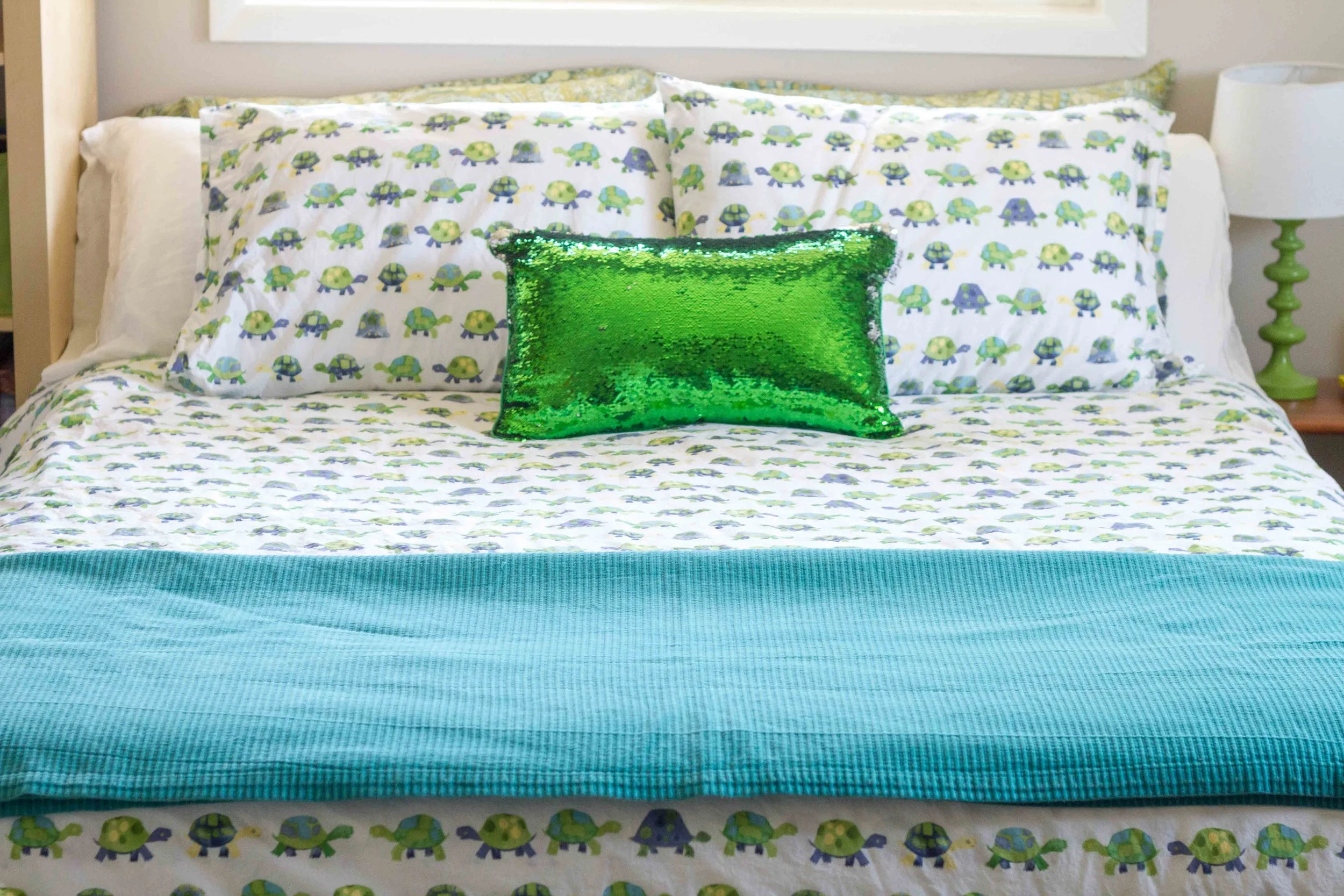 The direction of the pattern on your sheets will determine where you put your snap or button closures. If the top of the sheet (where the deep hem is) is intended to be folded over, then the pattern will run bottom to top. In other words, the top hem of the sheet will become the bottom hem of the duvet with the snap tape or buttons. If the sheet is not designed that way, however, you’ll want to put the snap tape or buttons at the bottom of the sheets, so that the closures are by your feet, and the pattern is running the right way.