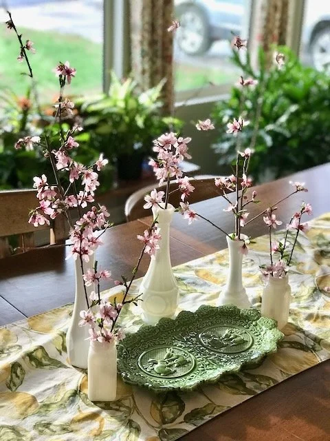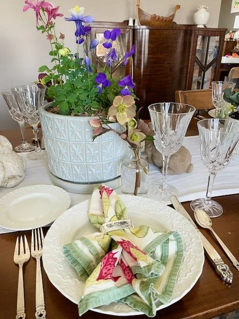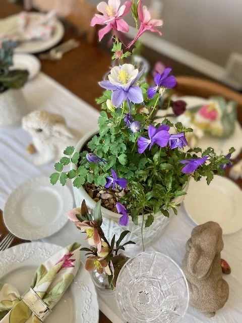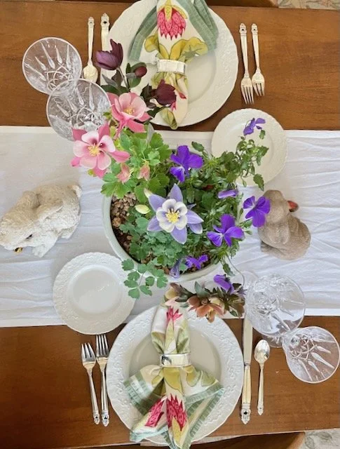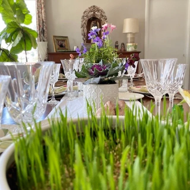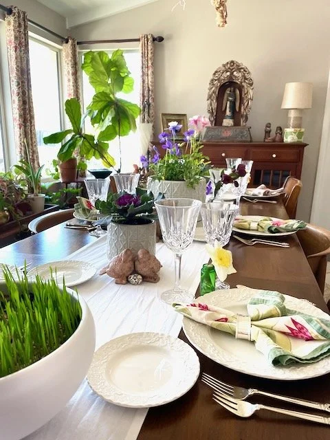 I love a beautiful table, and ours changes seasonally. By the time we get to Easter, I am so ready for a spring palette — pastels, flowers, and lots of green. Often my table brings the spring joy before the garden does!