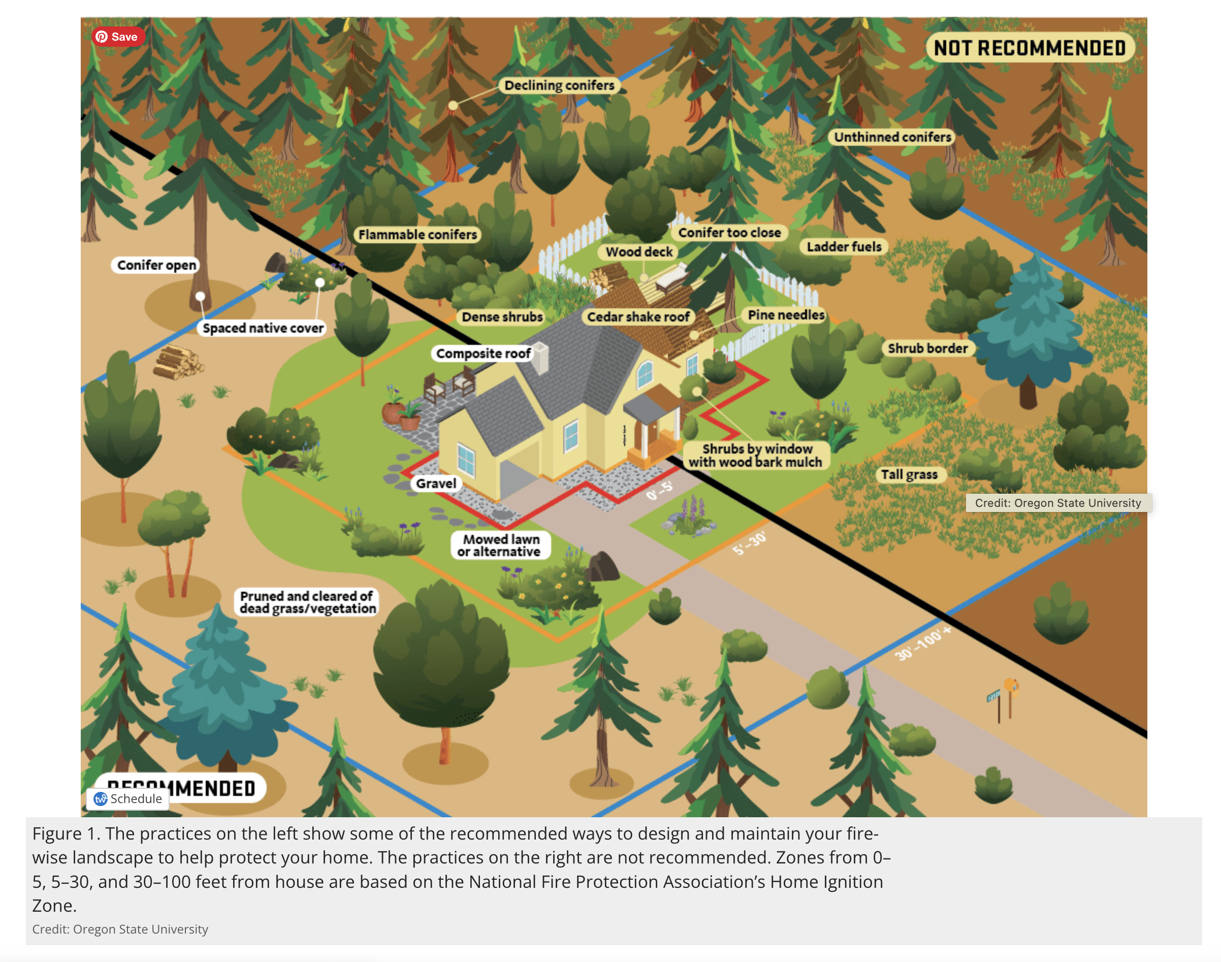 This diagram from Oregon State University is one of the best out there showing gardening in fire zones, but it is in a forest context — not suburban. Click the image for the source.