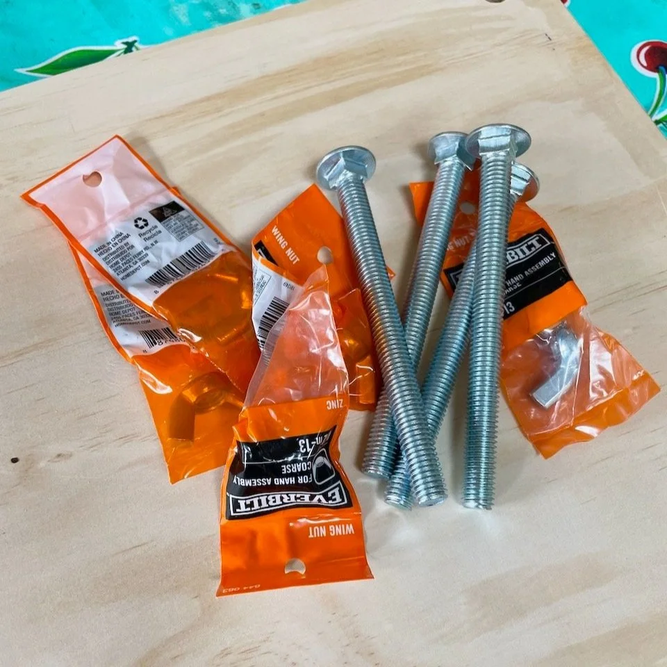 Thread the top piece of plywood onto the bolts. Secure with a washer and wing nut.