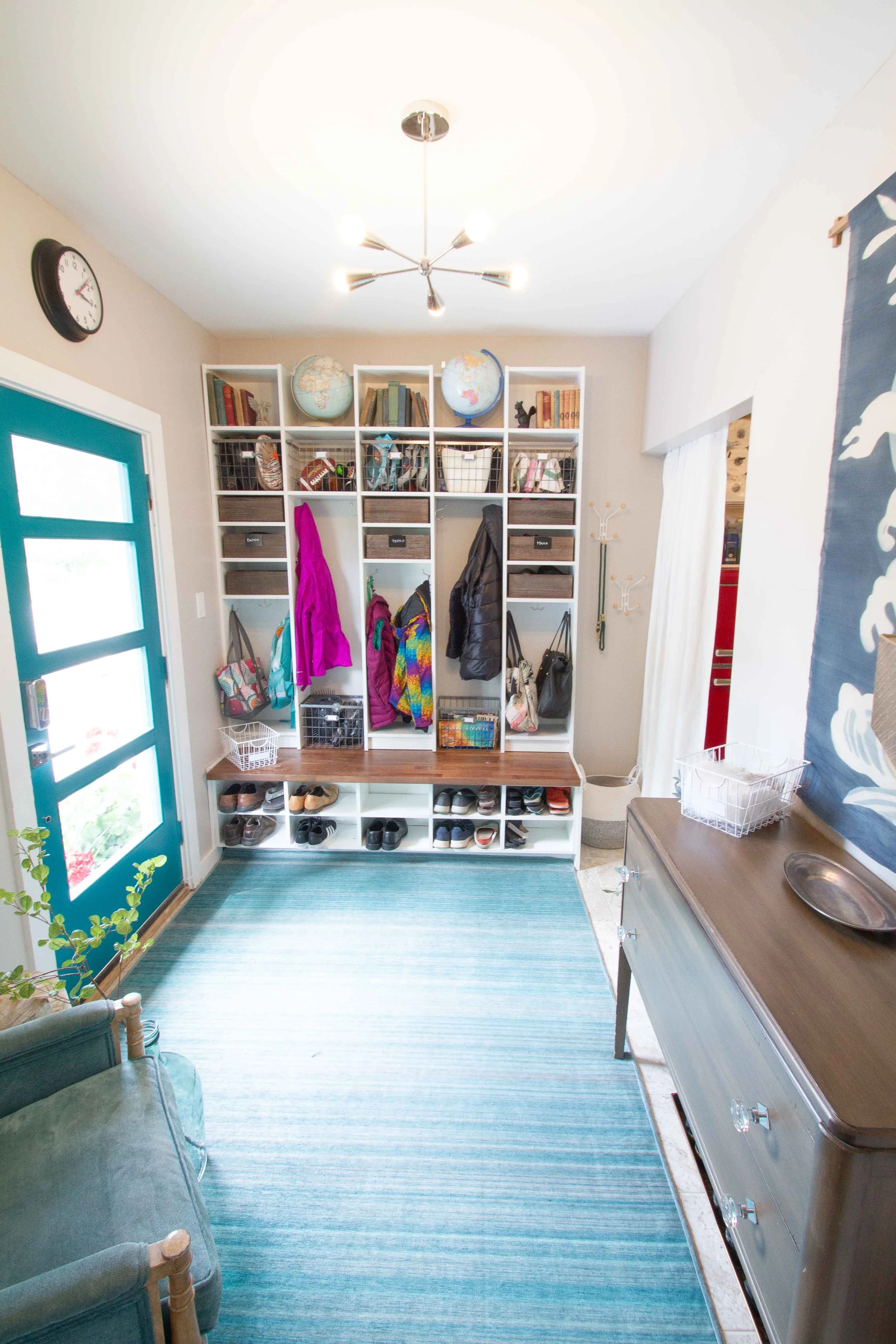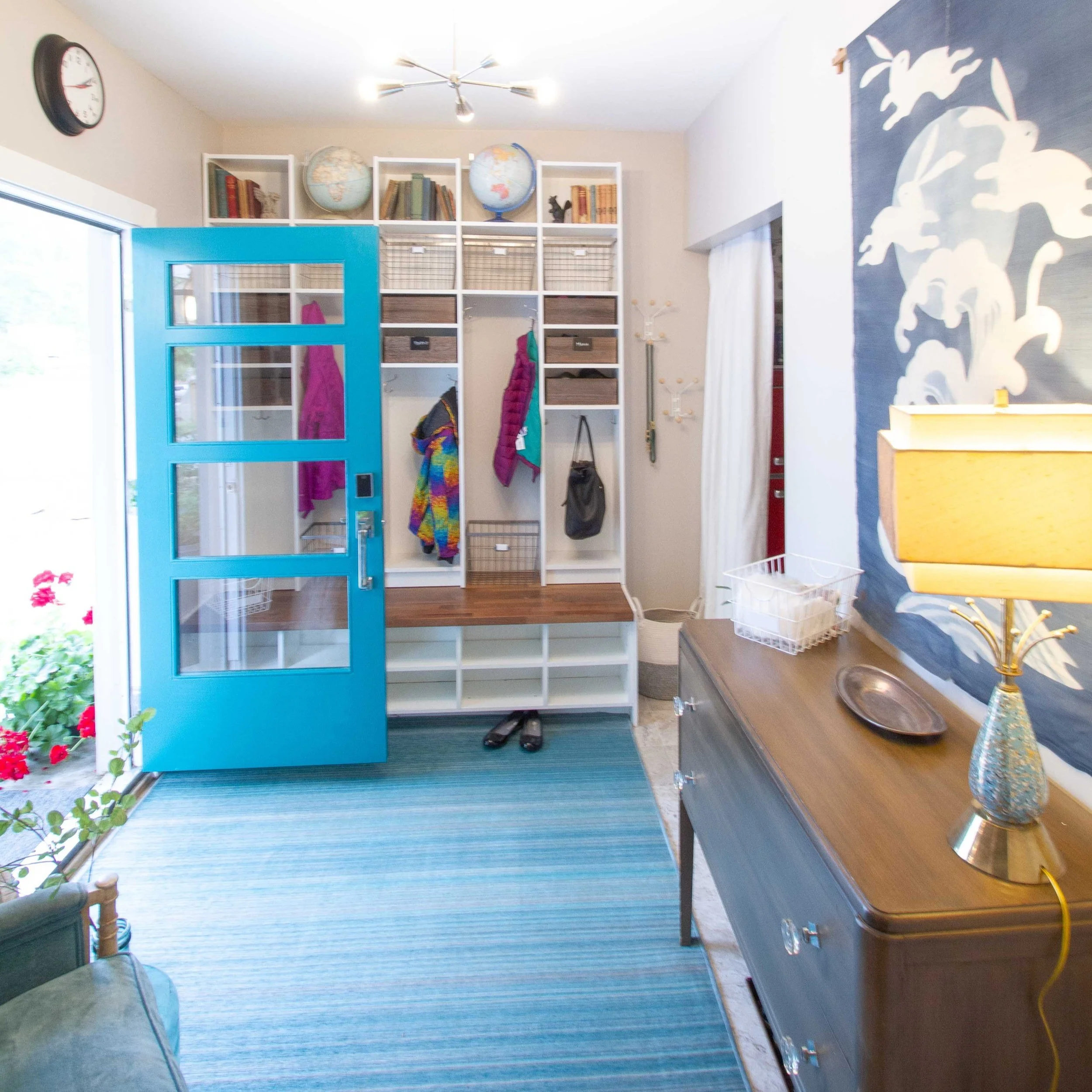 As part of the Mudroom Makeover, I hunted for a new Mudroom door. I ended up finding a matched pair of vintage Mid Century doors taken from a local church. I found them at an architectural salvage yard where they cost a small fraction of the price of brand new doors. They are gorgeous! I painted both the same shade of turquoise – a pop of MCM color which dramatically changes the curb appeal for our house. The entrances are both visible and don't disappear anymore.