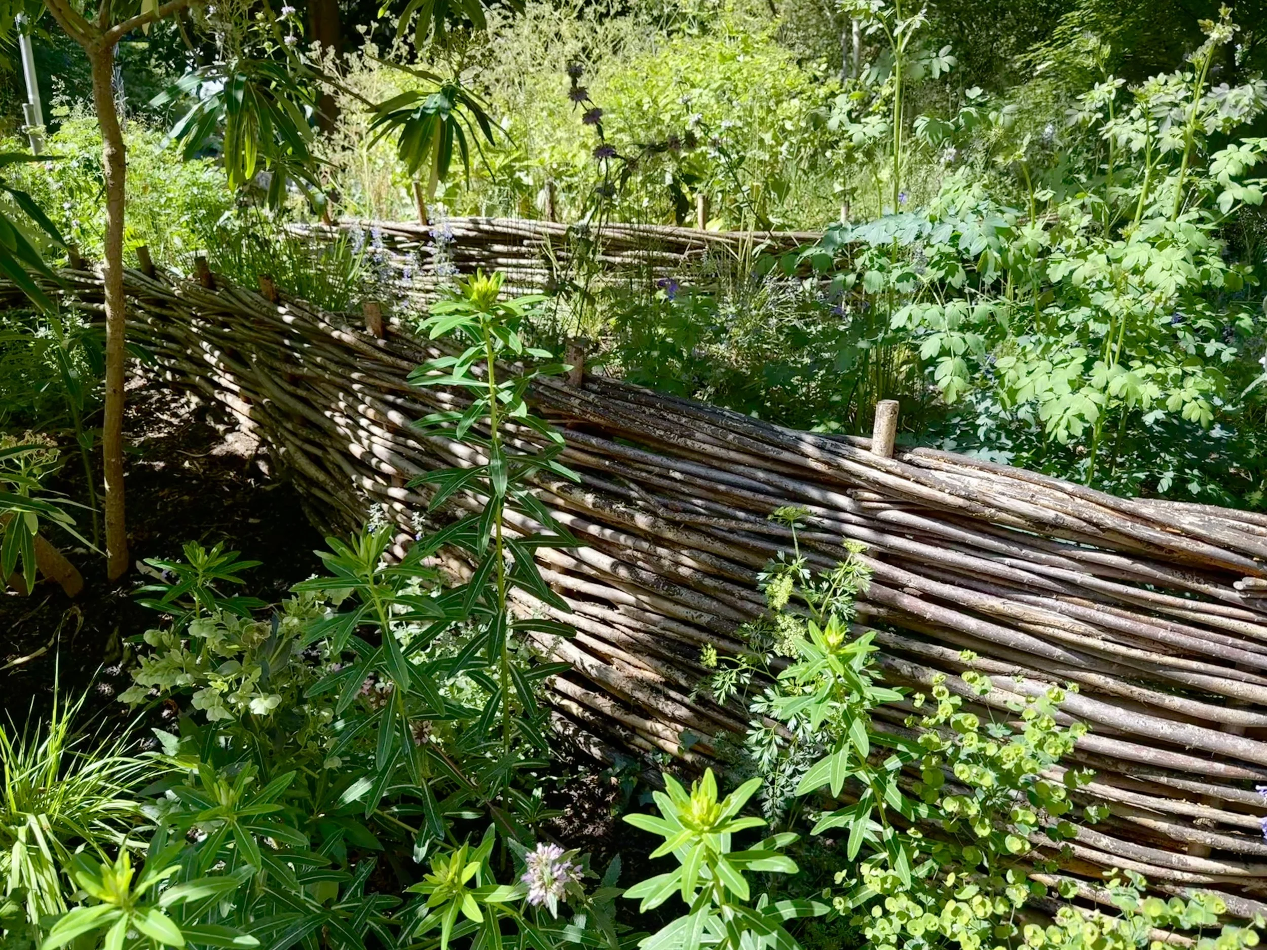 Another idea that I saw repeatedly, including in the container gardens, was wattle fencing. Wattle — a weaving technique created using young hazel or other flexible trees and shrubs — is quintessentially English country garden. It’s rare in North America, and generally what we see is faux wattle made from plastic. But there is no substitute for the real thing.