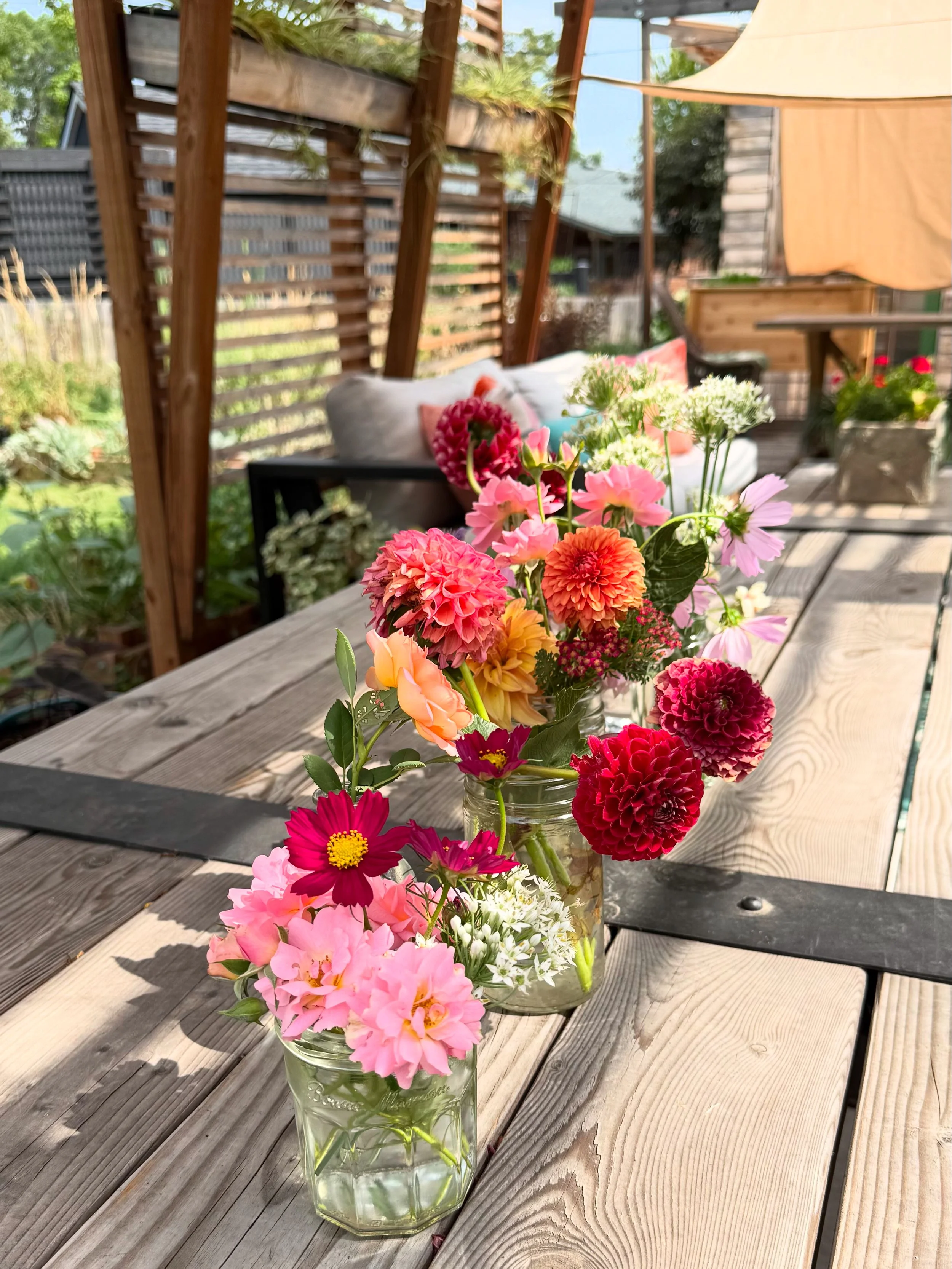 I keep cut flowers on the dining table almost all the time—usually extra clippings from bouquets I make for inside.