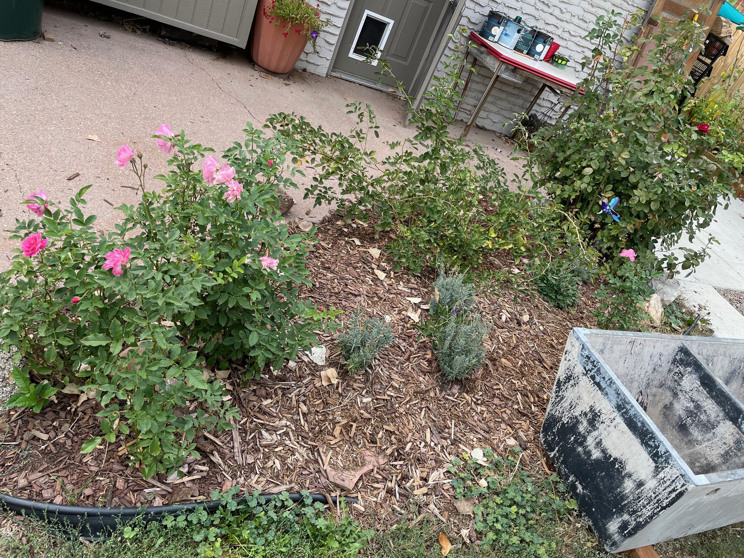 The Rose Bed in the second summer after lots of weeding, adding some lavender plants, and a good layer of mulch. Starting to look better!