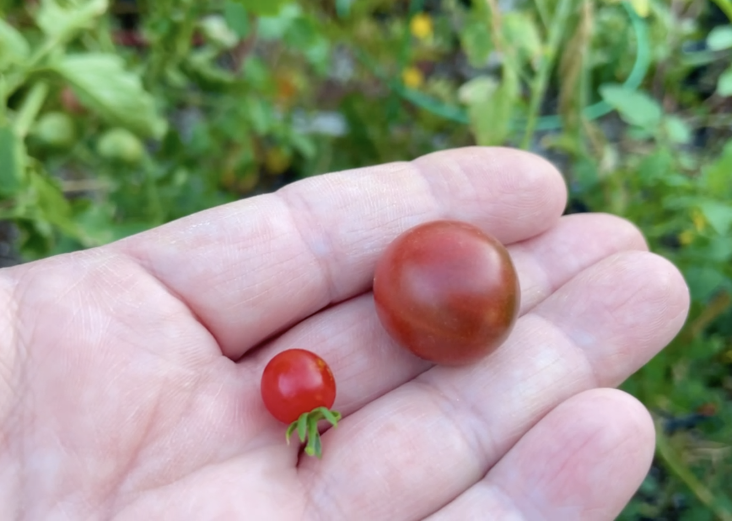 So this one is a wild tomato – and a different species than other tomatoes. But it is a really cool plant! My child came home from his school garden raving about it one day, so we grew it the next year. It's great! They are tiny little tomatoes – the size of peas. Delicious in salads, and amazing for kids (and grown ups) to just eat off the vines.