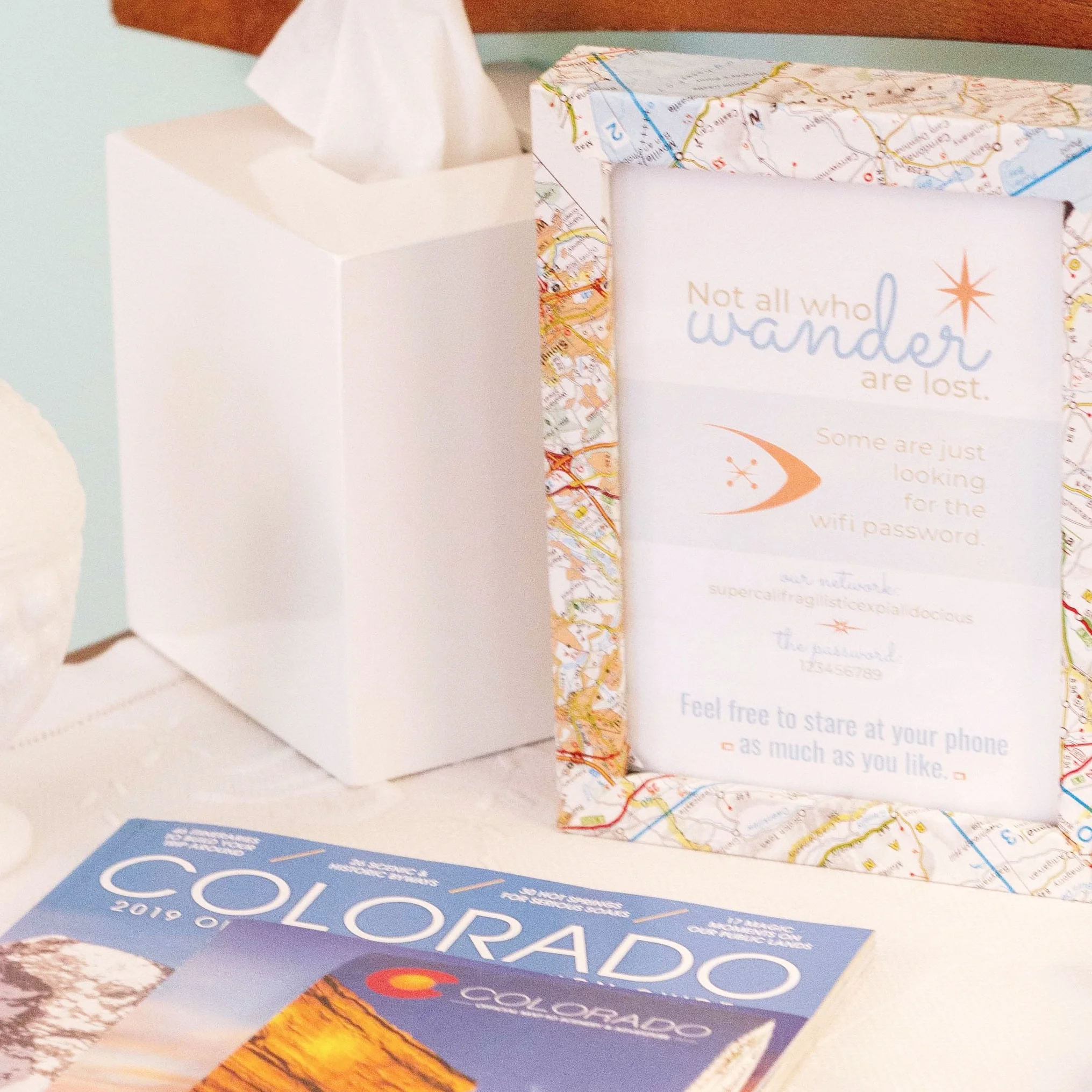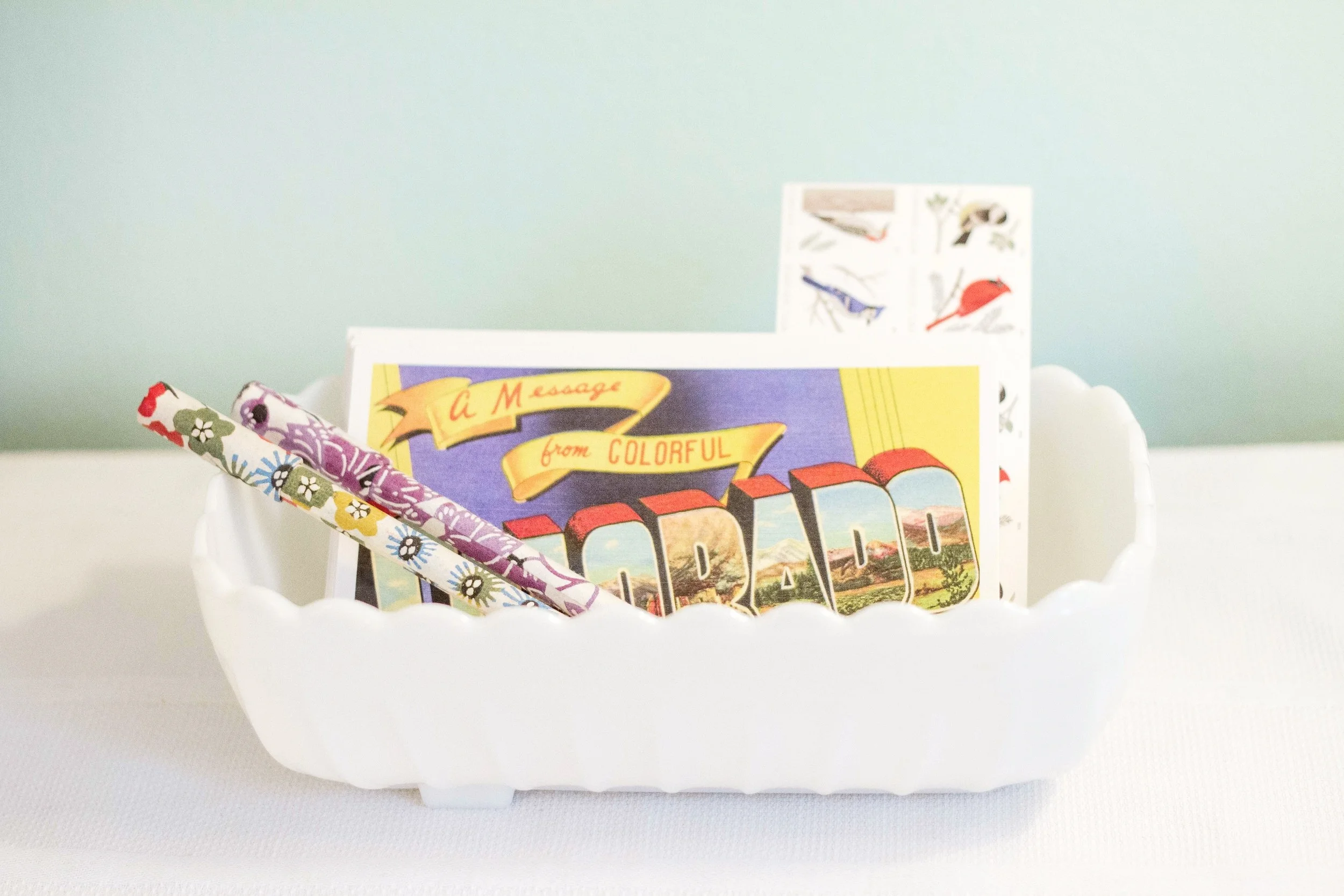 Every good hotel has some stationery and a pen. We do, too! I tucked some Colorado postcards, a few blank cards with envelopes, stamps, and a few pens for our guests as needed.