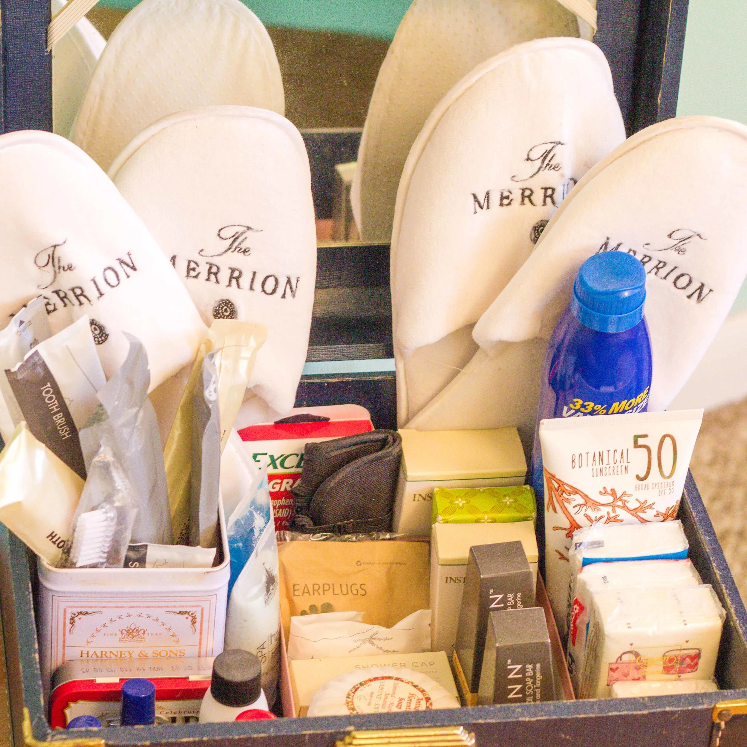 Since our Guest Room has a travel vibe, I picked up this amazing vintage train case. I then filled it with toiletries for my guests in case they forget anything on their journey. It is stocked with tooth brushes, toothpaste, packets of tissues, soap, shampoo, conditioner, mints, and even slippers. Most of these items have been collected on my own travels, and I always tucked them away in a cupboard, but now they are out in the room, and my guests will be able to take full advantage of them. The best part: I can tuck everything in and close the case so nothing gets dusty between visitors.
