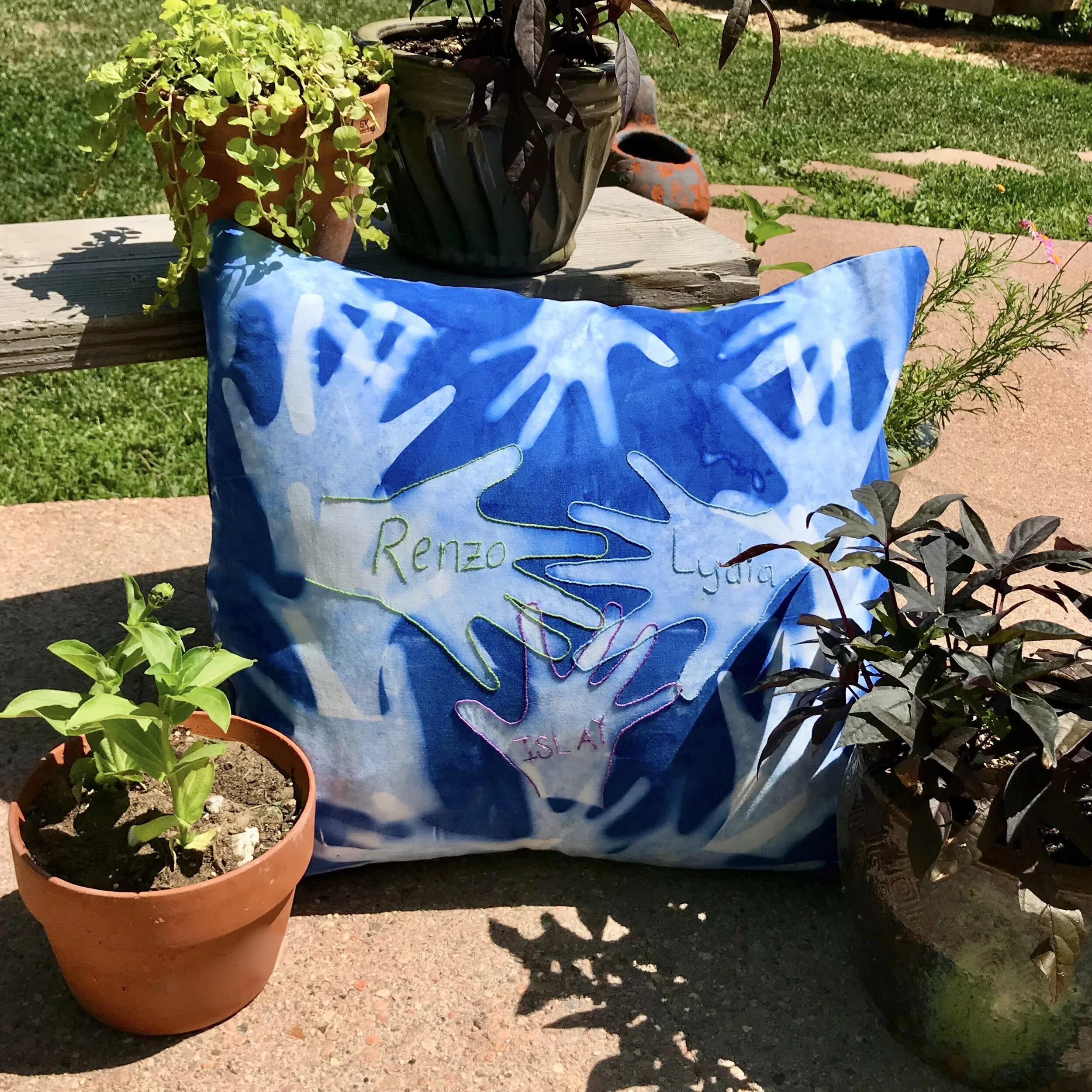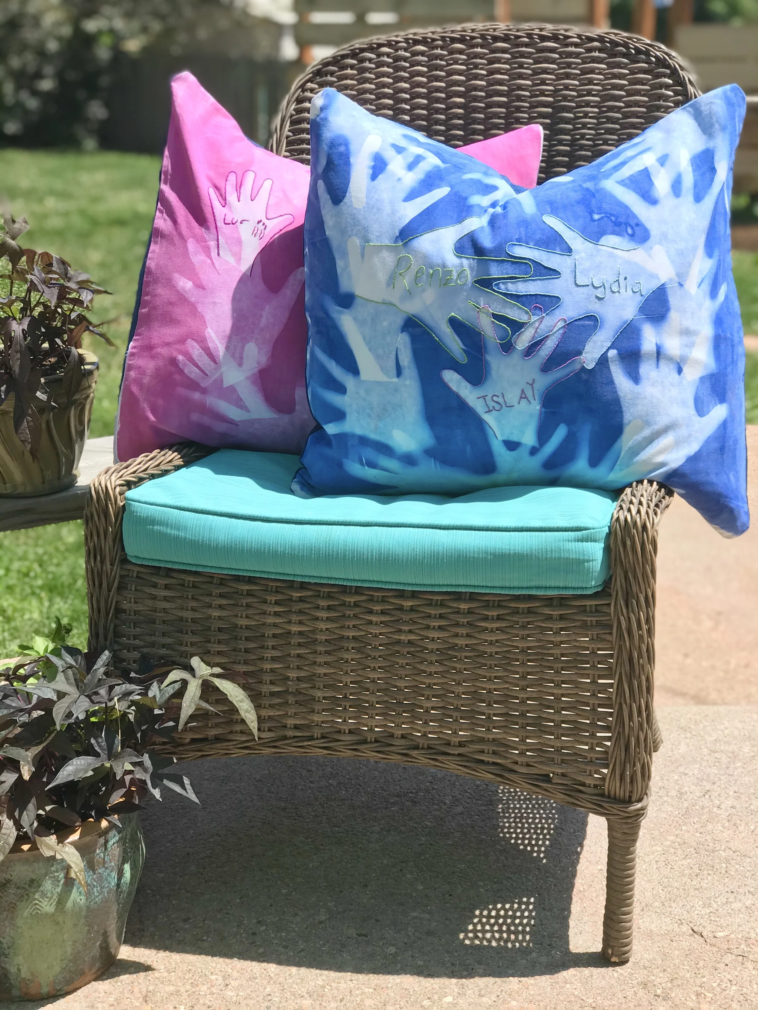I absolutely love the finished product! I made our handprint sunprints into pillows for Mother’s and Father’s Days, but I have several other ideas: