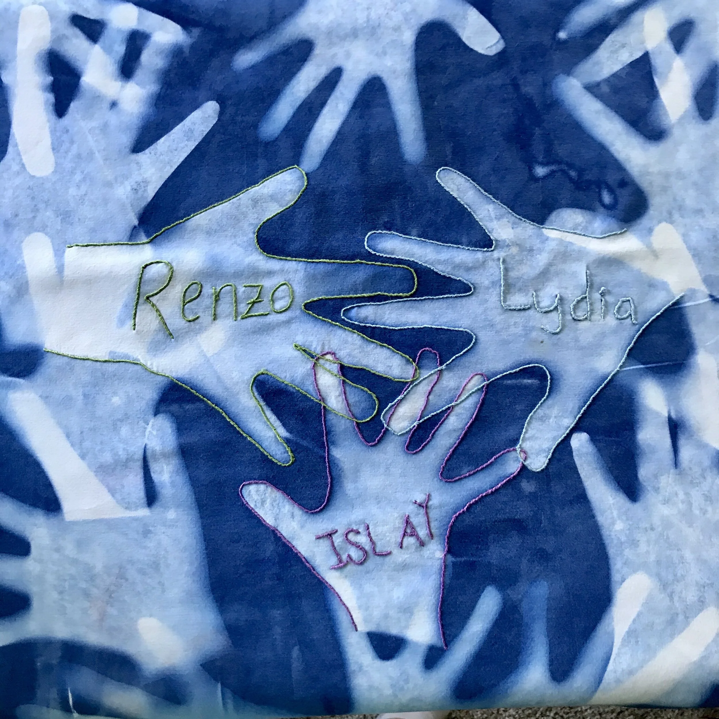 I am into embroidery, so I outlined one handprint from each child and added their signatures as well. I love how this turned out, but it is absolutely an optional step!