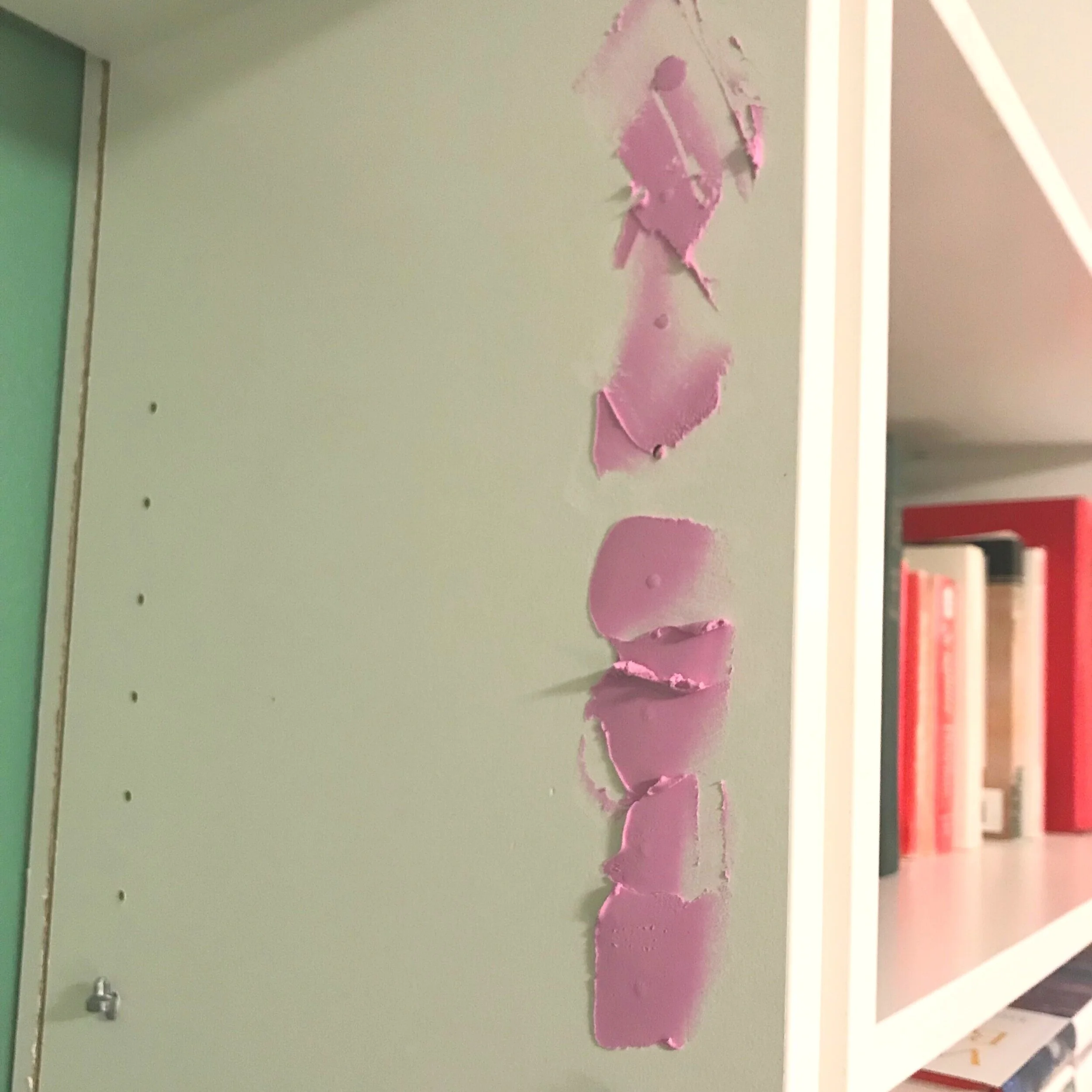These holes have just been finished. The spackle is still pink and very visible.
