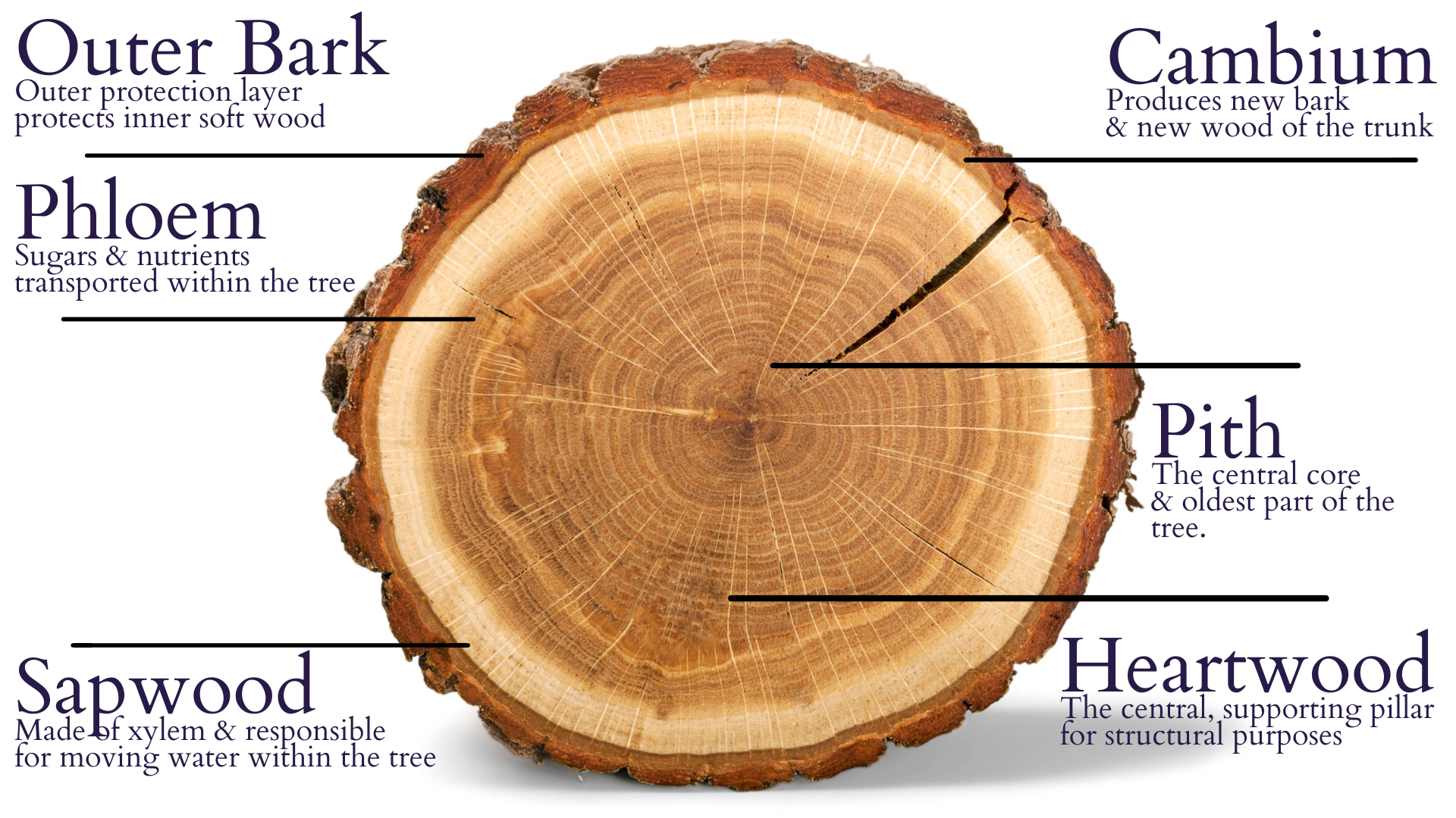 Water is absorbed through the outer layers of the trunk (sapwood), not the inner heartwood. Damaging the bark reduces the tree’s ability to hydrate.