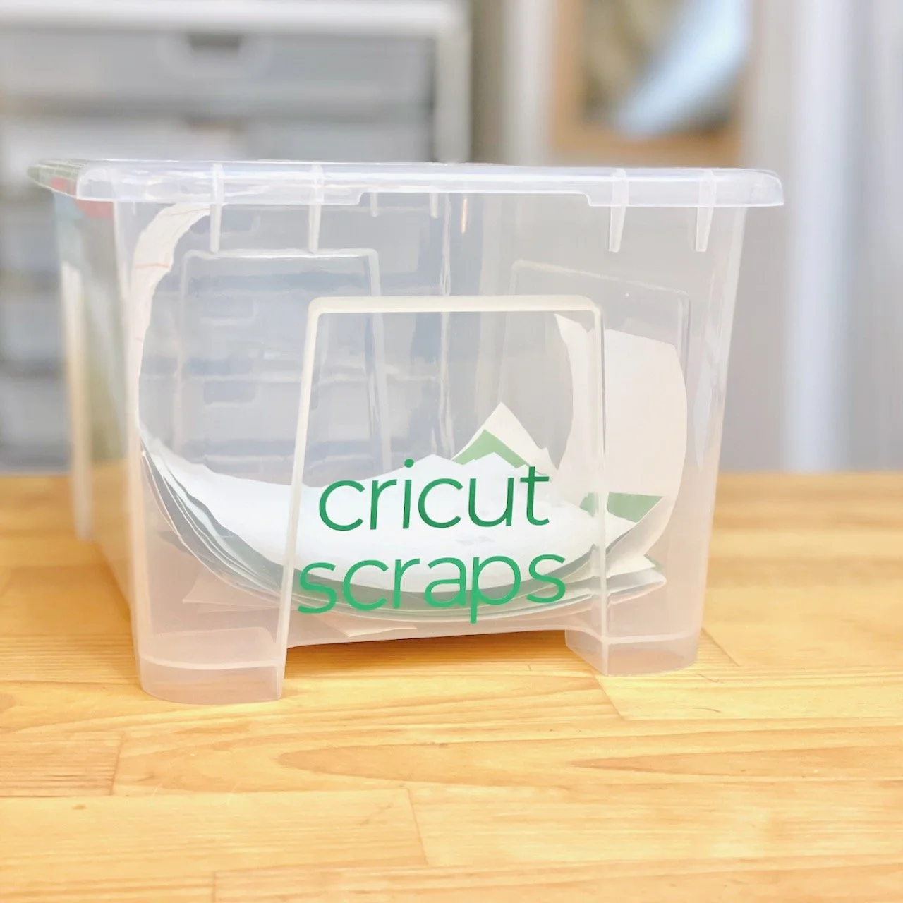 Alternatively, just create a bin that you throw your scraps in for later. This works well if you use the same kind of material most of the time. If you use multiple kinds of vinyl, for example, take the time to write what kind it is on the back of each scrap for later. Or create separate bins for each type of material.
