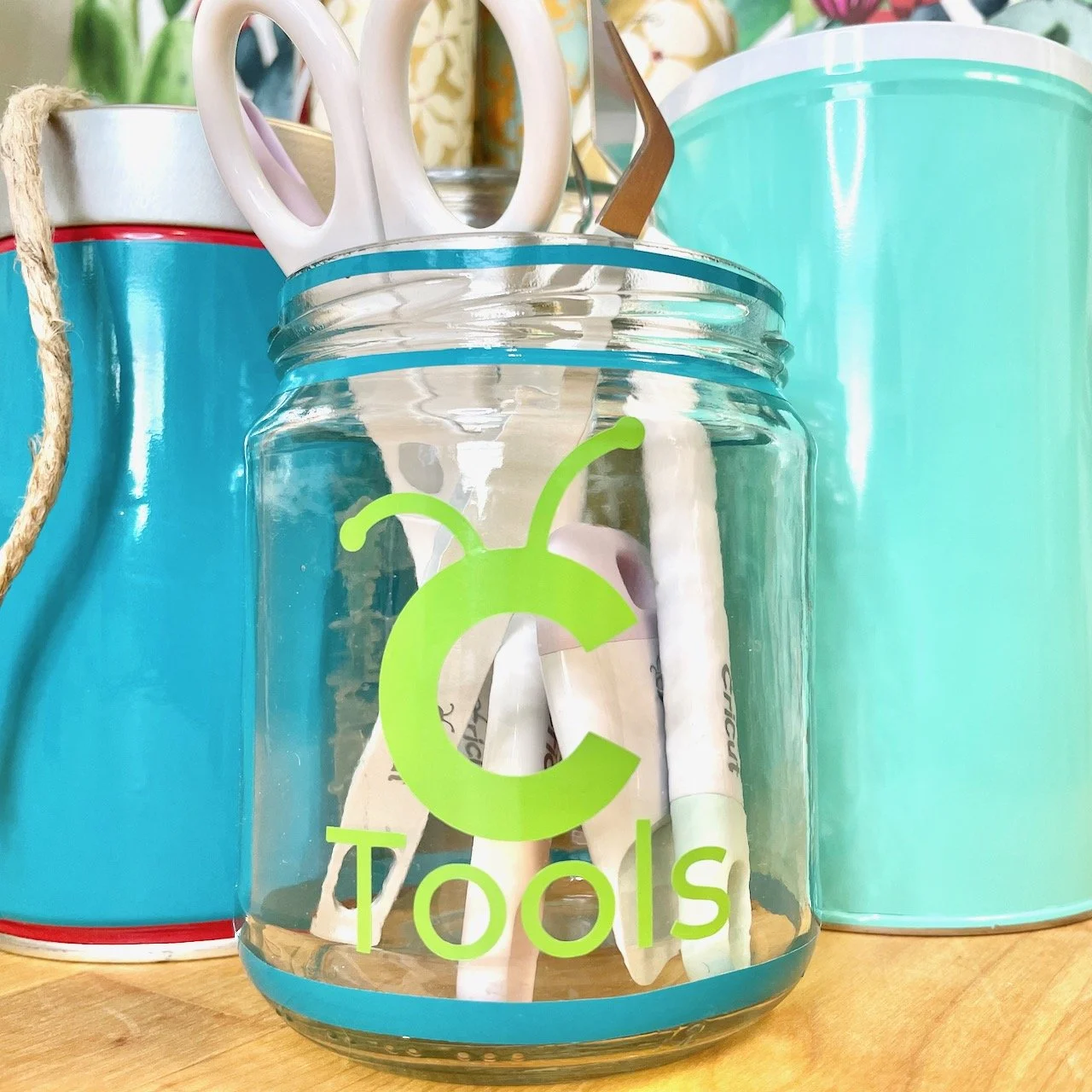 Small tool storage doesn’t need to be fancy or expensive to get the job done! I took an empty glass pickle jar and dressed it up with some vinyl — cut on my Cricut, of course, and now I have a set of weeding tools all in one place sitting on my desk. Simple and cute!