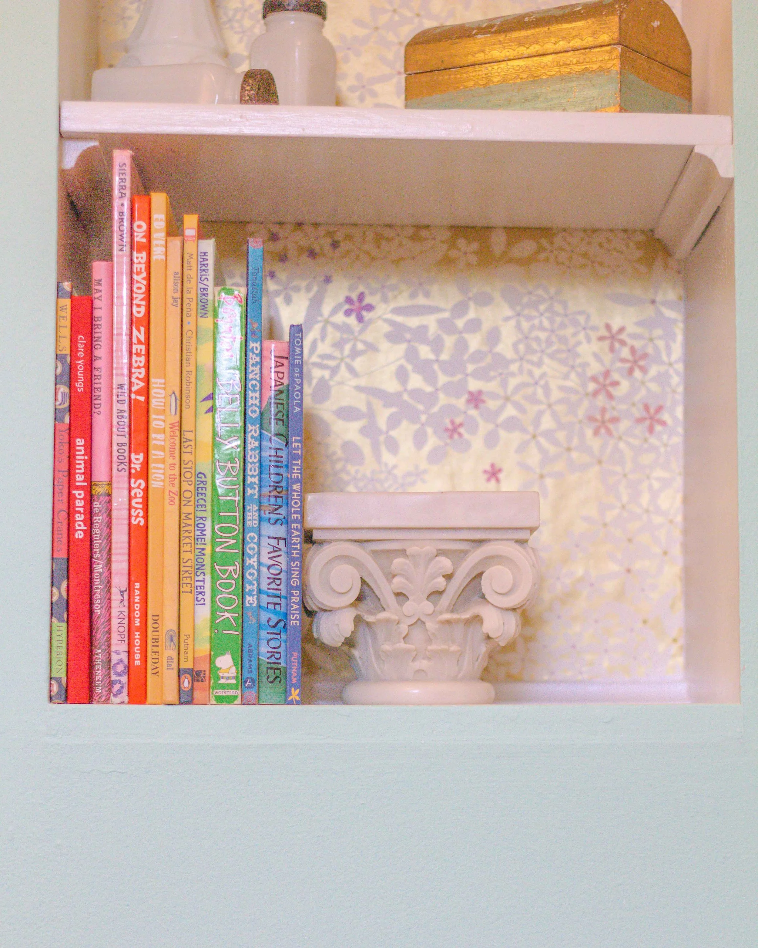 At some point in this home’s history, someone added several little built-in alcoves. They are inset into the wall, and make for charming decorative niches and add a little character. But like so much of our house, they were painted white and were dull when we moved in. So, for the Guest Room Refresh, I wanted to make the niche in the guest room pop with just a bit of color. I considered paint and wallpaper, but I wanted more pattern than paint would give, and the niche is only four feet tall, so buying a whole roll of wallpaper seemed like a waste of money.