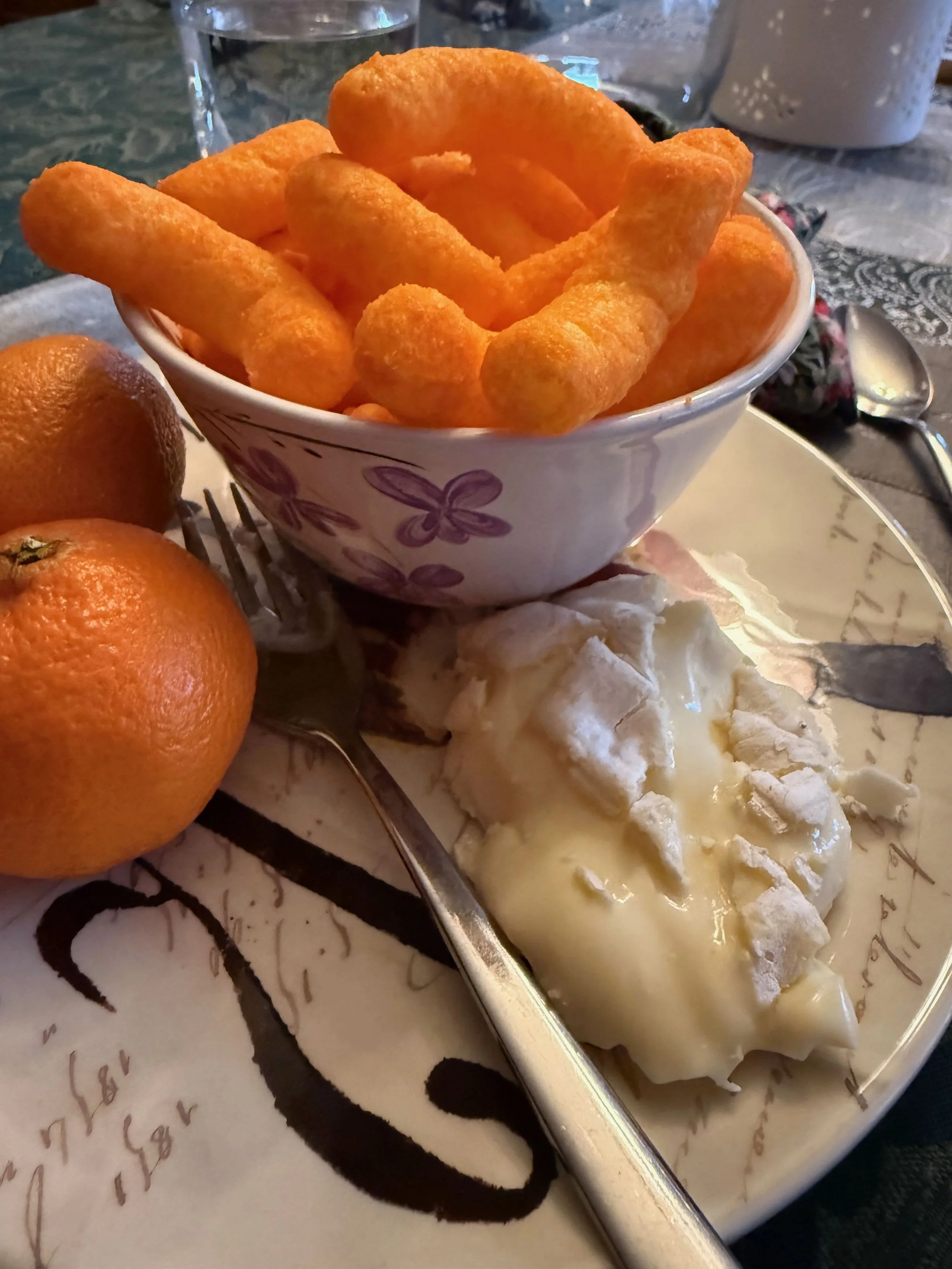 Below: a fine Brie, clementines, and Cheetoes make a perfect snack at New Years.