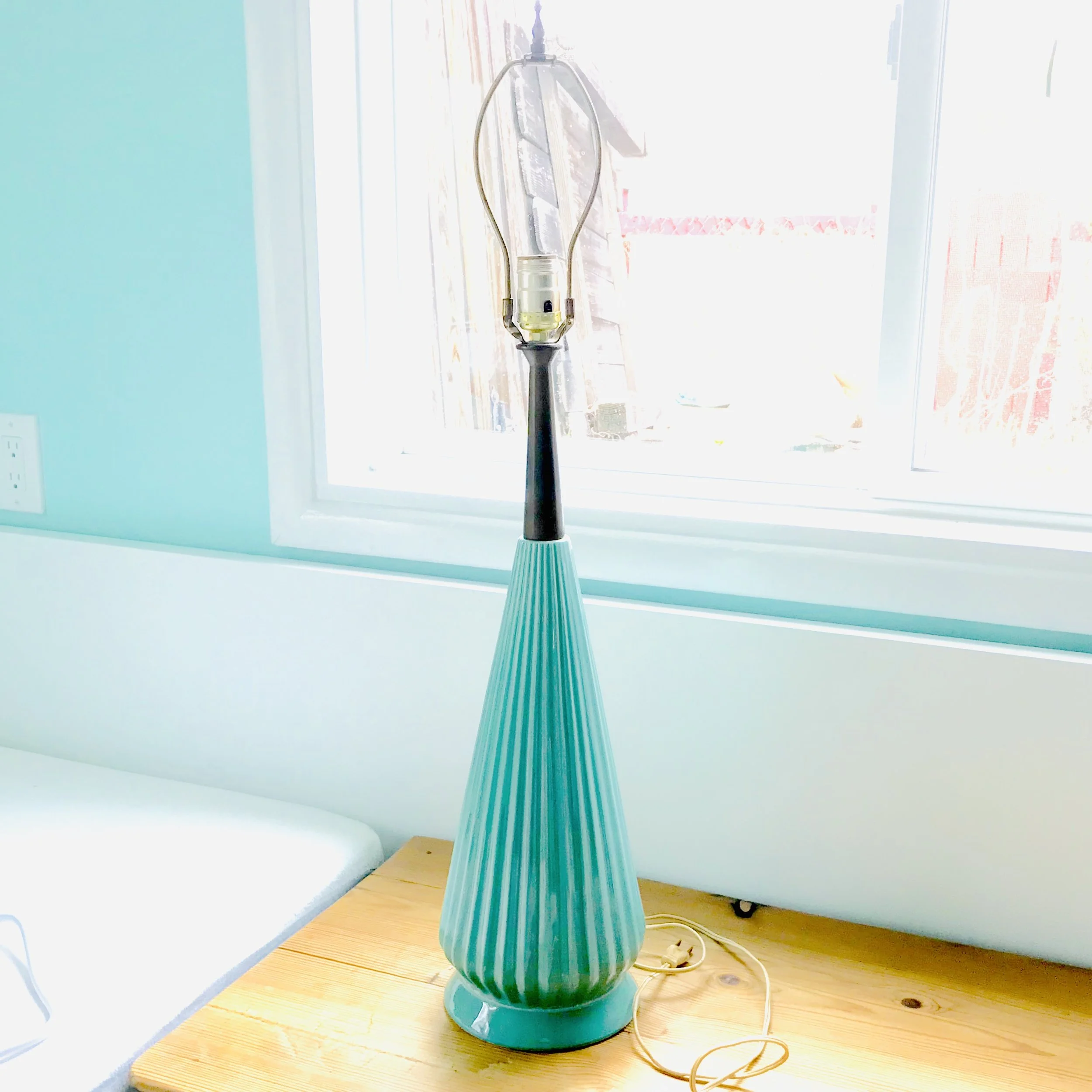 Not only do these colors evoke Hawaii, but they are also perfect Mid Century turquoises. When the wall color first went up, it felt a little 50s diner to me. Now with more wood in the room, it is reading quite Atomic Ranch.