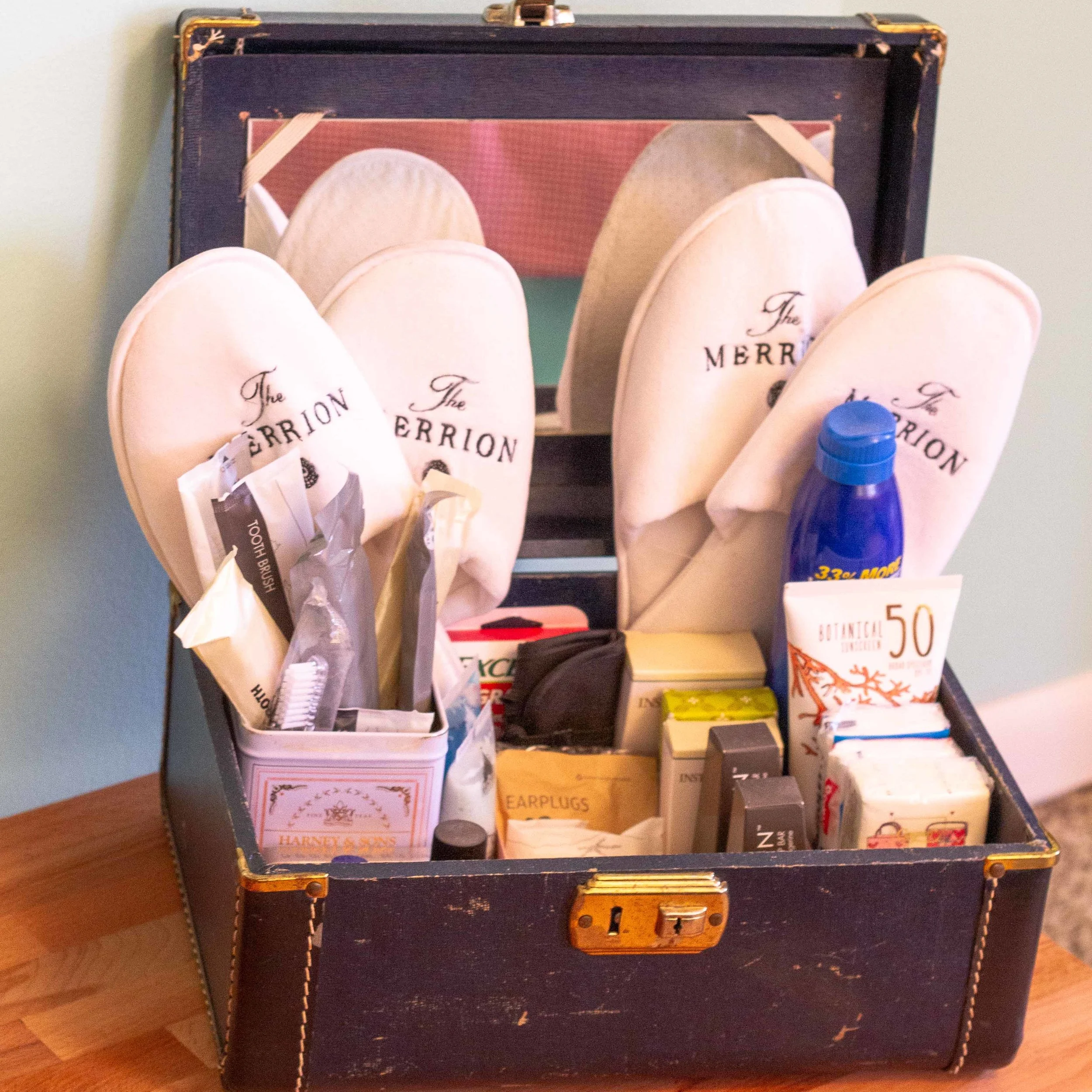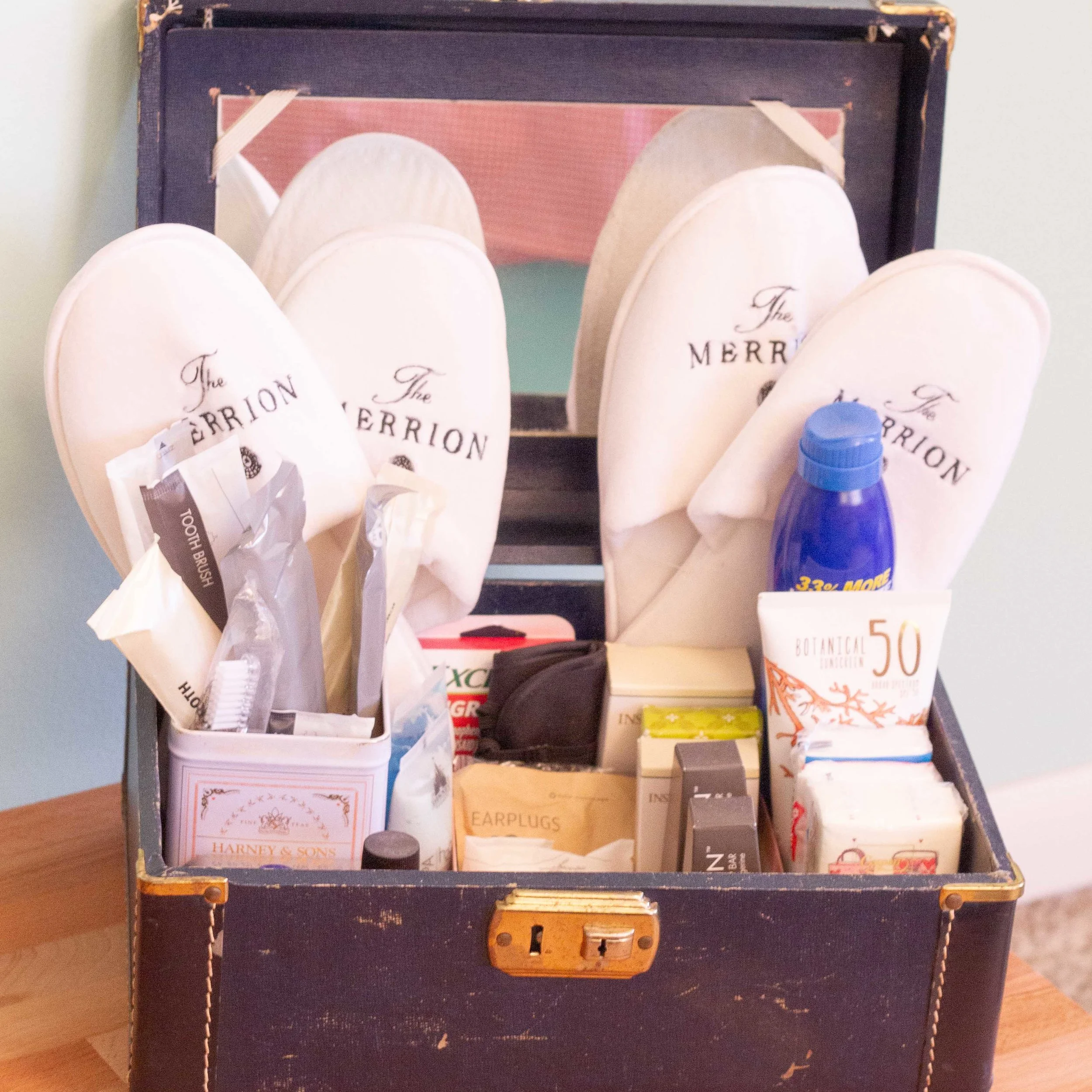 For less than $20 I found an antique train case and filled it with sample-sized essentials for my guests.