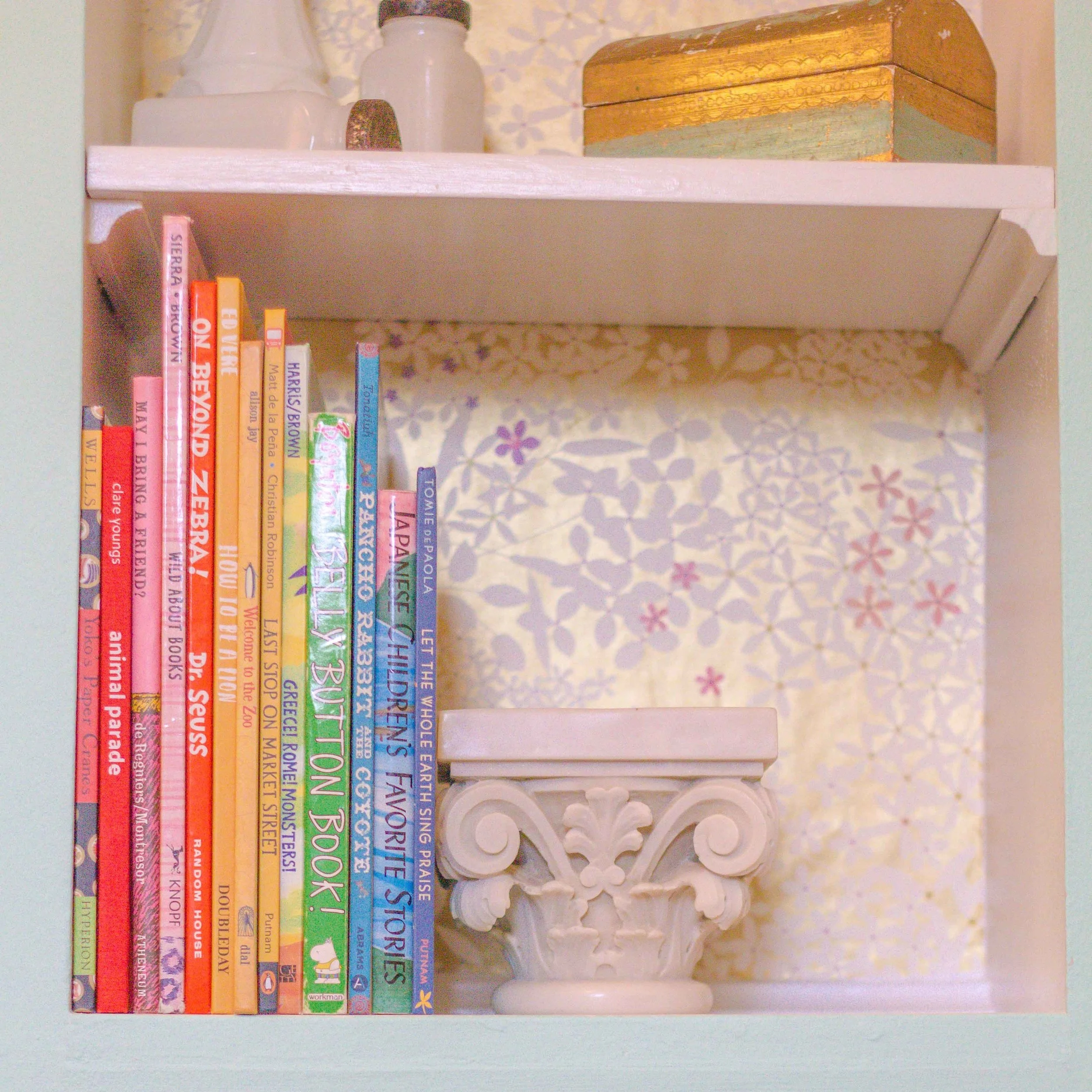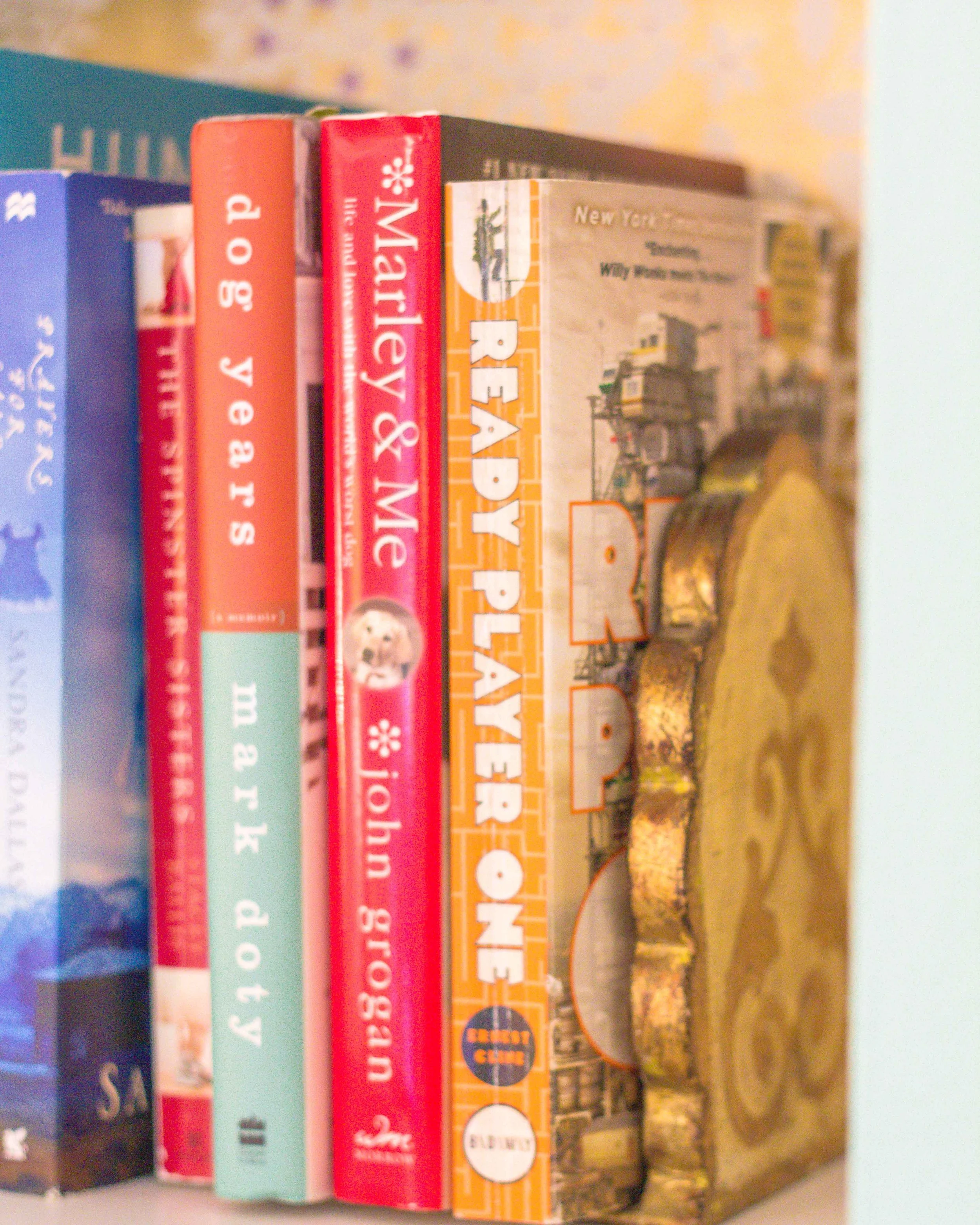If you follow me on Instagram you know that a few weeks ago I gave the little bookshelf alcove in this room a wrapping paper makeover. While the room is painted this lovely aqua, the alcove was white. It needed a little color and life, so I toyed with several ideas before deciding I wanted to put a pattern back there. Rather than spending $50 or more for a roll of wallpaper when I only needed 4’ of material, I papered the back of the shelves with wrapping paper at the tidy sum of $10 total. There is a full tutorial on this process as well.