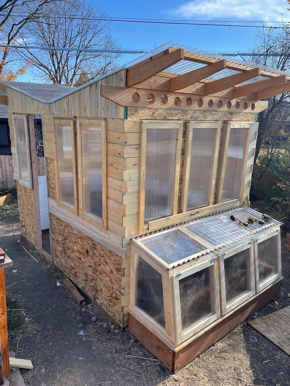 Given all of those constraints, we did a lot of research on keeping greenhouses warm -- and cool. We have worked to maximize the amount of sunlight all day and will be using several layers of plastic to create an insulating layer. We will also be creating a Trombe Wall of sorts to store heat during the day and then radiate that heat into the Greenhouse at night. Any space not needed for sun exposure will be heavily insulated to keep heat in during the winter and out during the summer. We have designed a water-collection system to fill two rain barrels inside the Greenhouse which can then be used to water plants as needed. And the interior has been space-planned for storage as well as work area and spaces for plants of all sizes. More details on all of this and how it works to come!