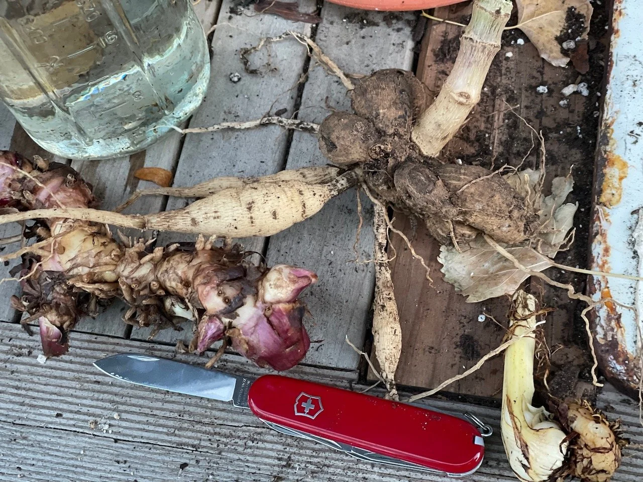 Left to right: Canna rhisome, Dahlia tuber, and Gladiolus bulb