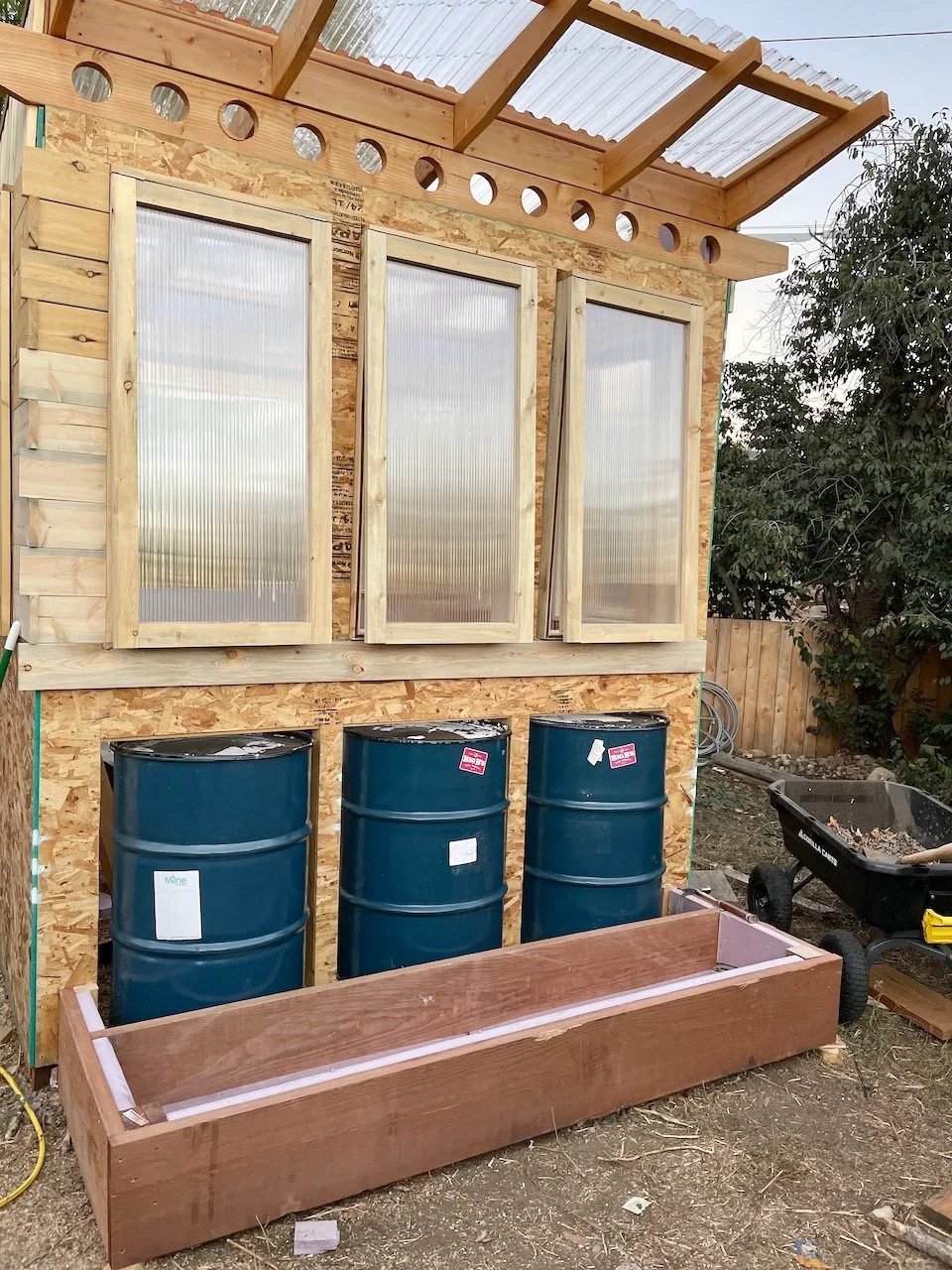 The southwest Trombe wall. The barrels will heat up and then release that heat into the greenhouse overnight keeping everything warm.