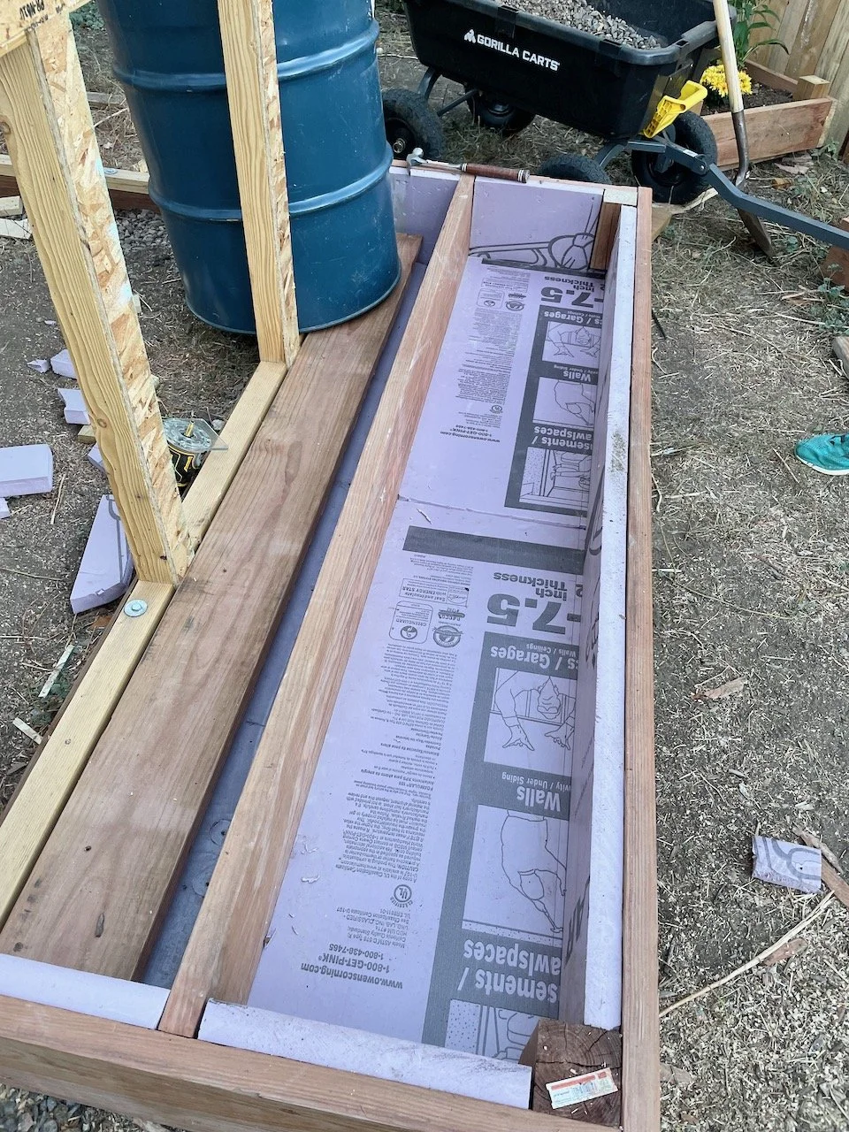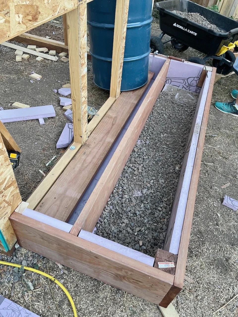 The coldframes are filled with gravel first and all of the sides are insulated to prevent heat loss.