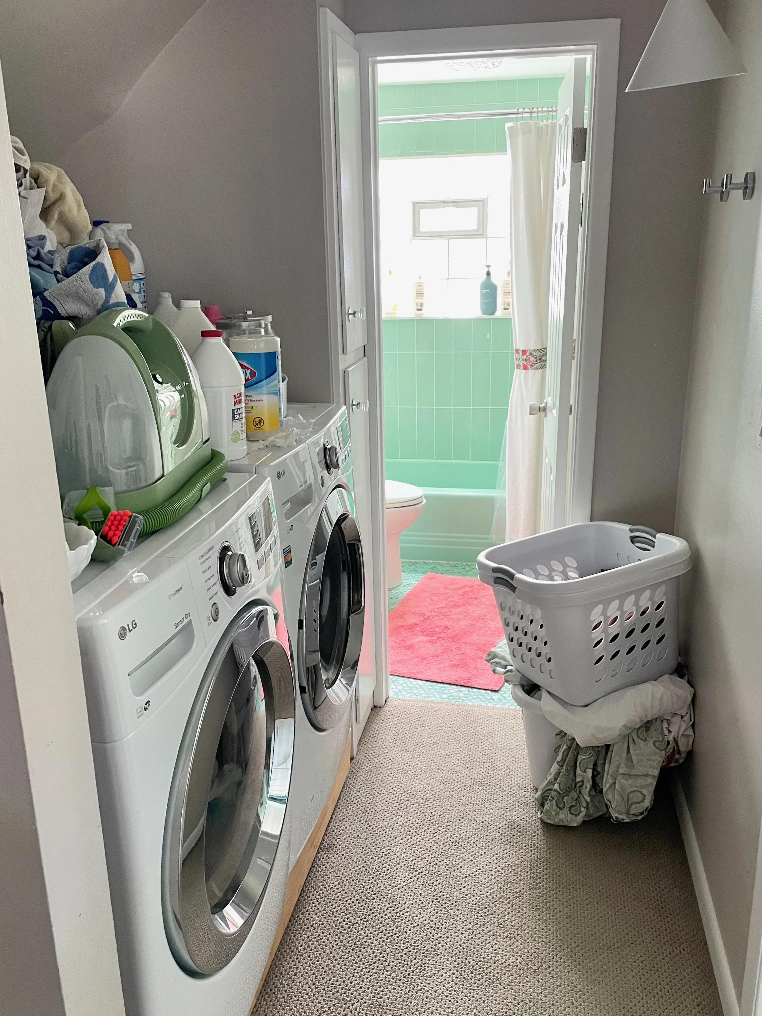 The sloping ceiling makes storage a bit of a challenge, but as I said before, this is tucked under the stairs, so there’s nothing to be done about that. And washing machines have gotten bigger since this house was built in 1958, so this area is a little undersized for the machines. But it’s what we have to work with. I can’t create more space here, so I just need to use this space as efficiently as possible.