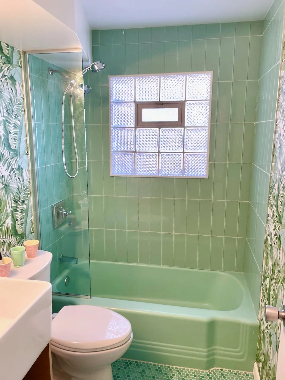 New glass installed to solve my crazy soffit problem. Honestly, I can’t even believe this is my bathroom!