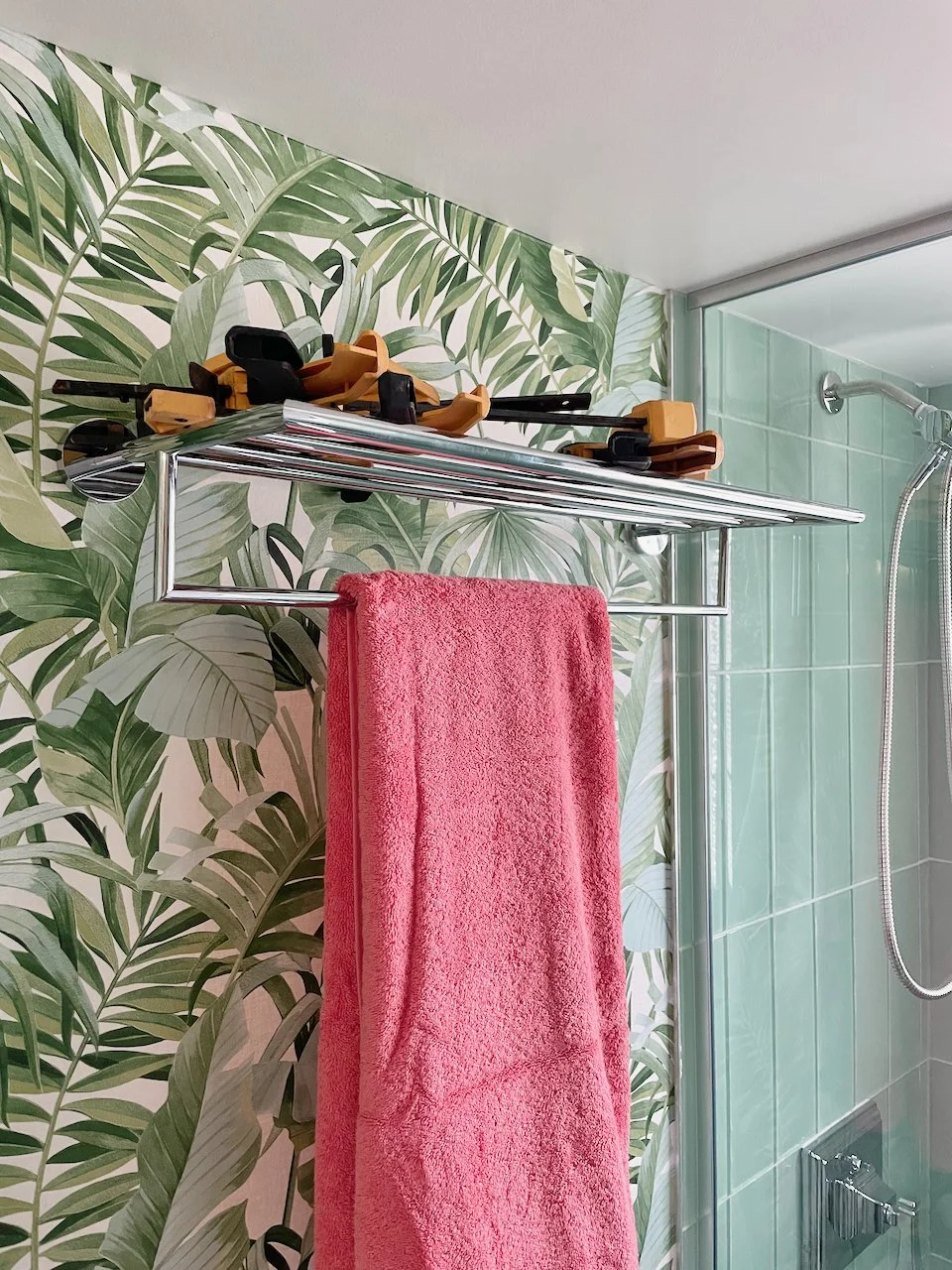 Now that the glass is installed, we are down to finishing projects in this bathroom. That includes installing all of the fittings that complete a bathroom — hooks, toilet paper holders, towel bars, and the like. Most of these items were given to us by Speakman, and they are gorgeous!