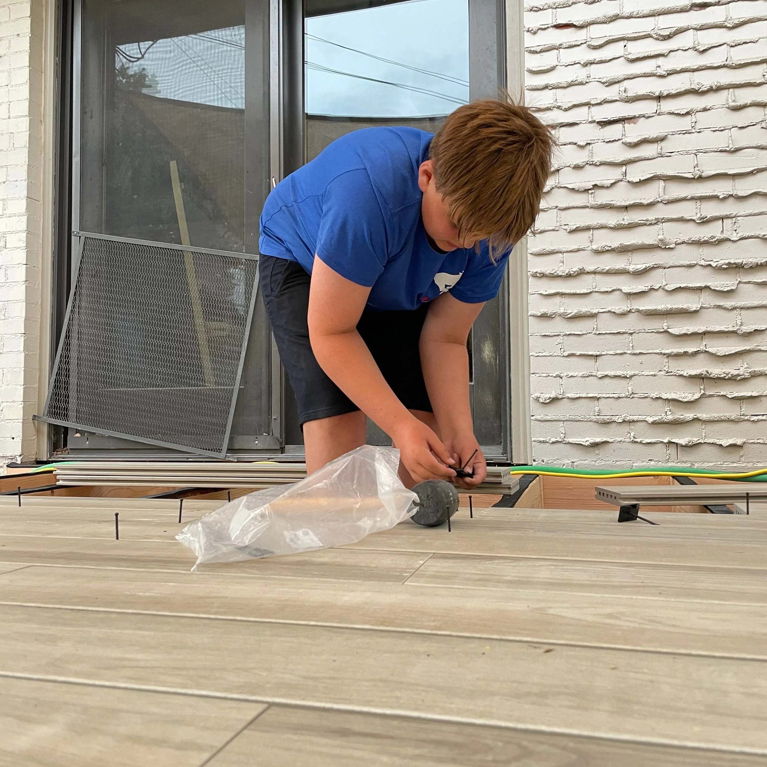 Our son was a huge help on this project, and he quickly learned how to install the Tanzite Stone Decking.