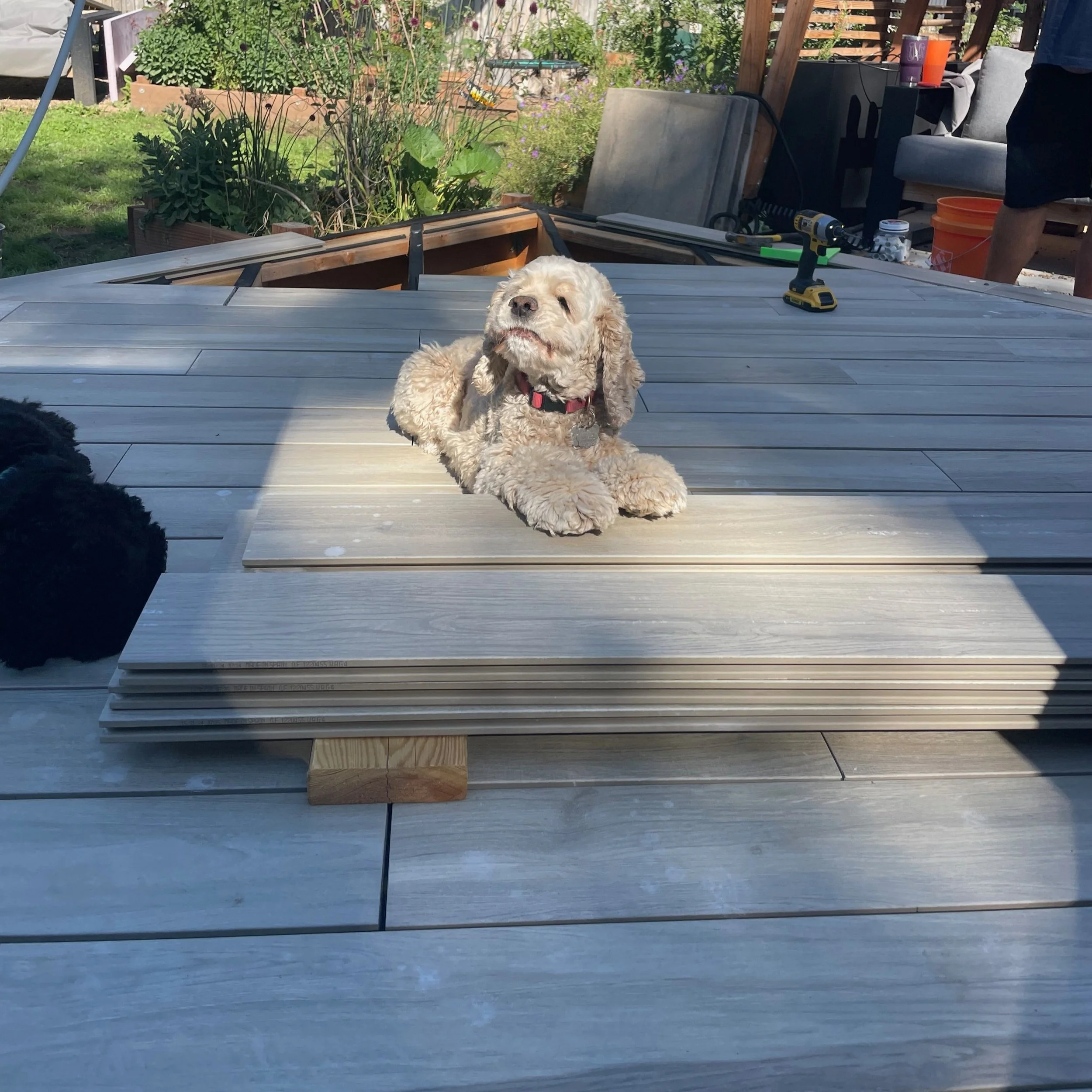 Demolition is a stressful process for pets, so plan for their comfort, too. The concrete rubble was hard on our dogs' paws. And the framing was an obstacle course for them. We could see their relief when we started to install the decking – finally they had a smooth surface again!