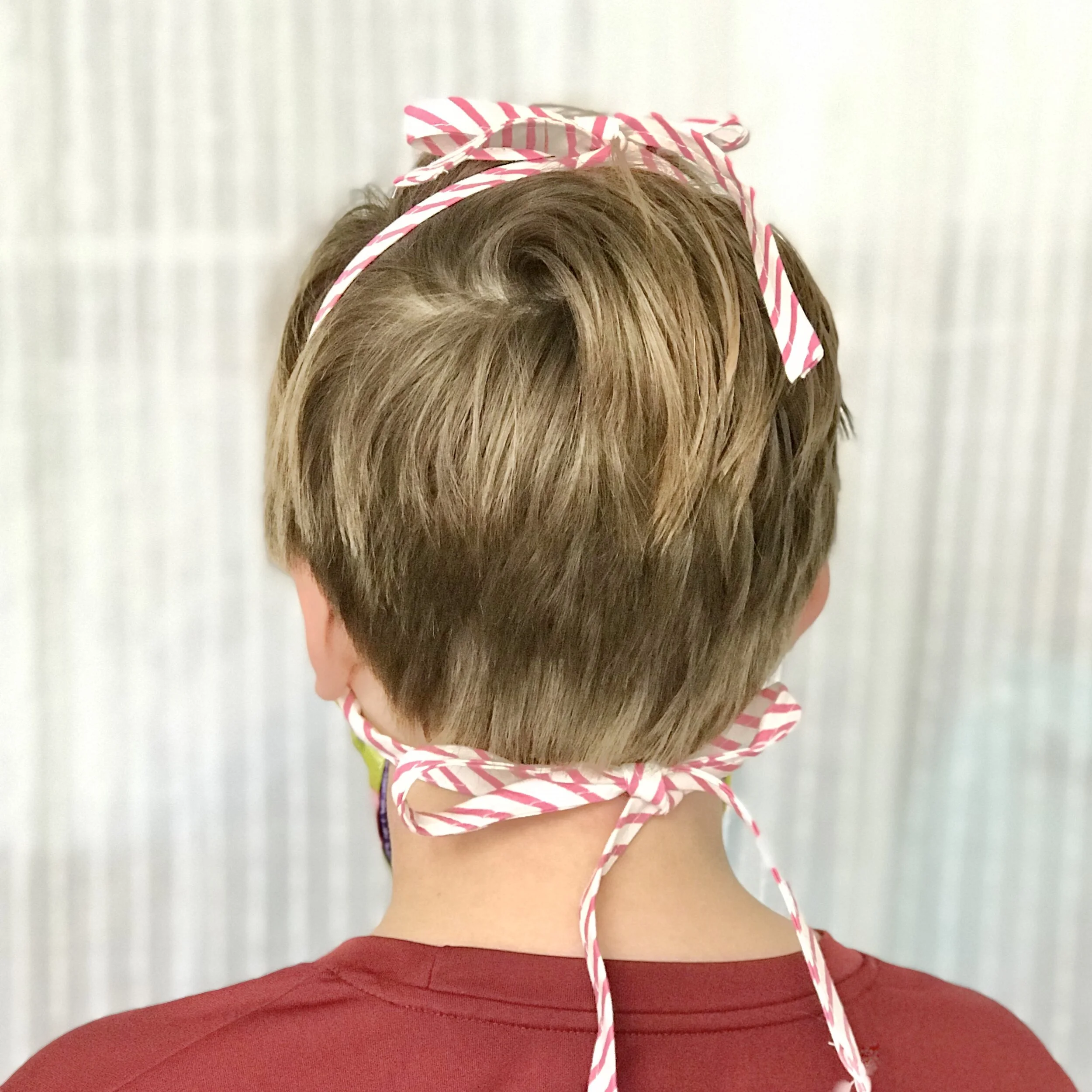 Bias tape or ribbon ties should be long enough to tie over the top of the head and then at the back of the neck. They can also be held securely in place using barrettes or other hair accessories as needed.