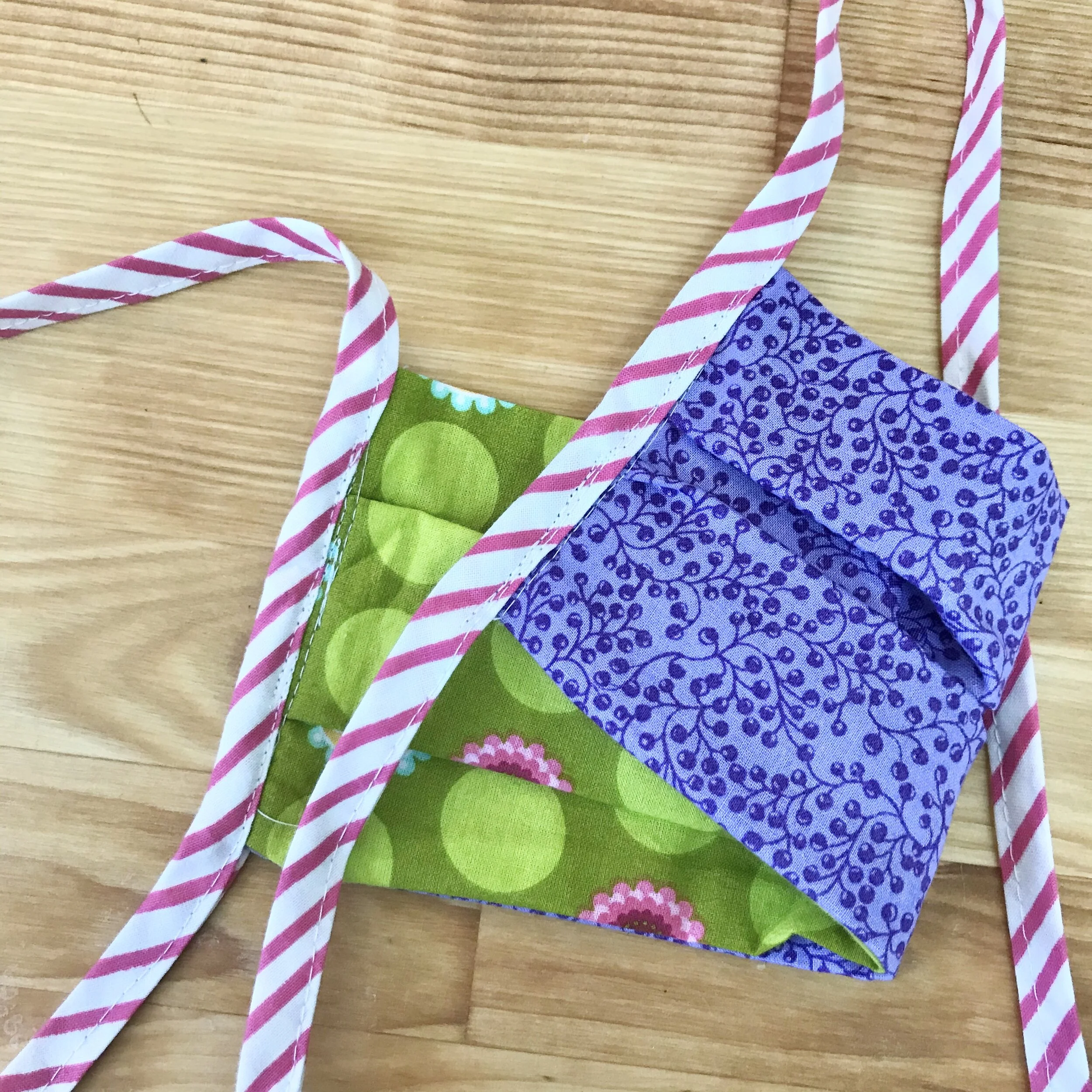 Bias tape or ribbon can be used as ties. You’ll need two sets of ties for security. They can also be added using the Ear Loop method. Simply sew four pieces of bias tape or ribbon instead of creating loops.