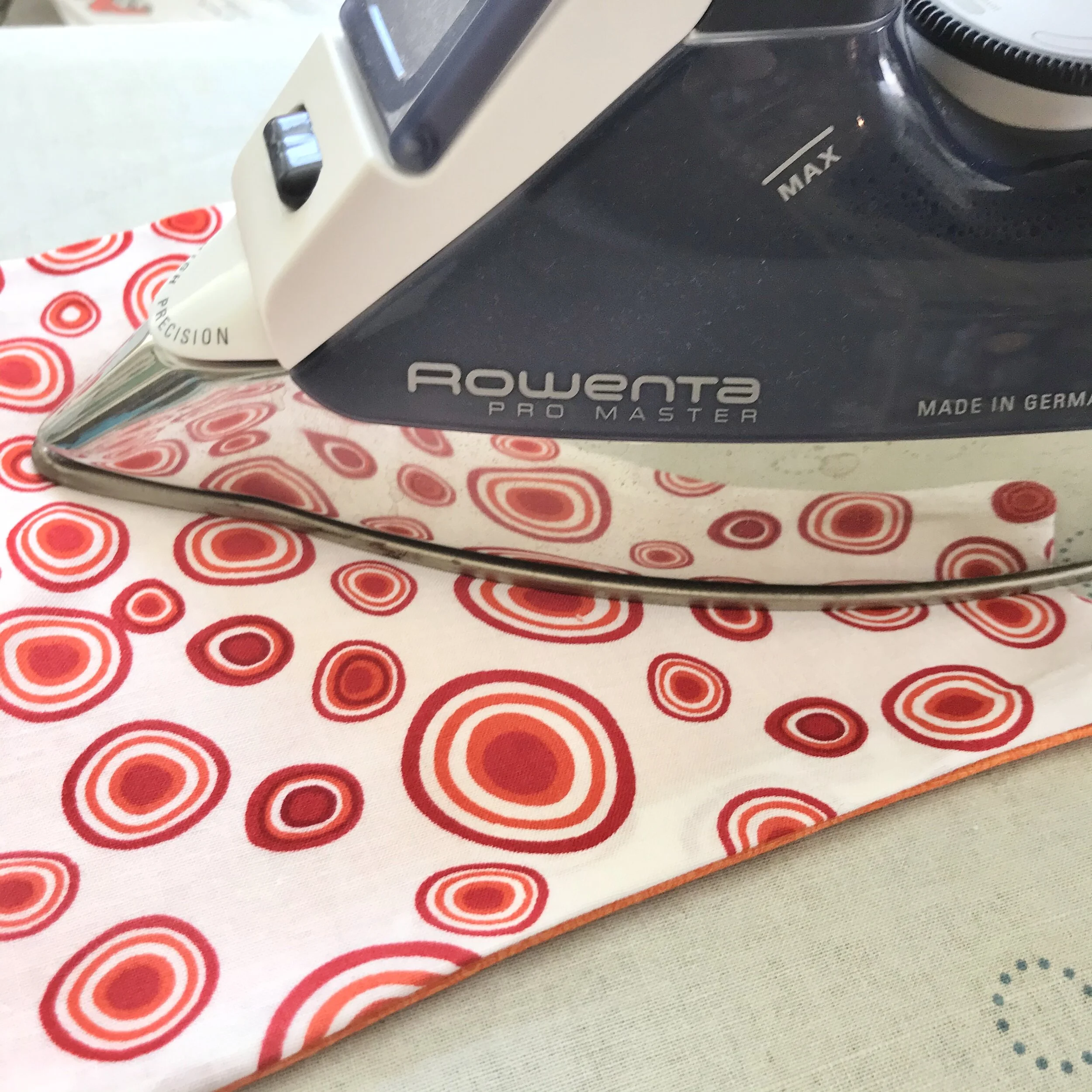 Press the fabric. At the top of each piece, fold and press 1/4” over. Then fold and press again to create a double-fold hem. At the bottom fold and press 1/4” over.