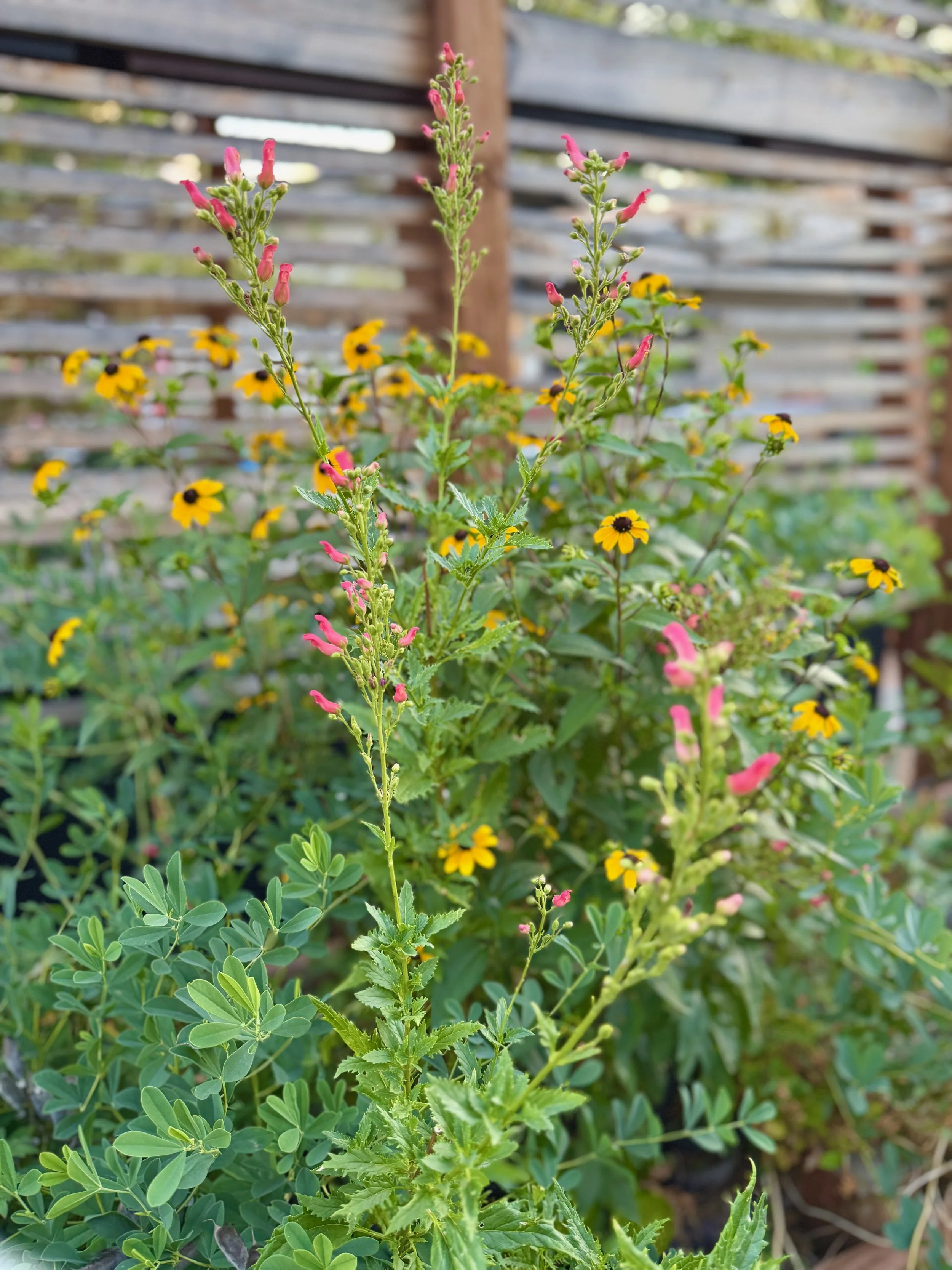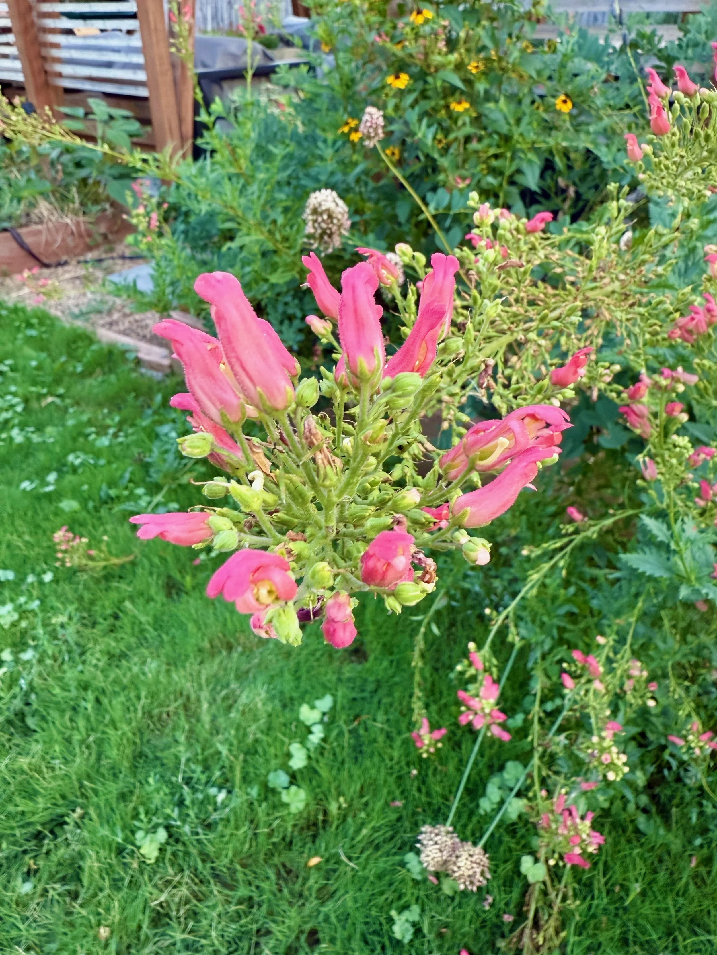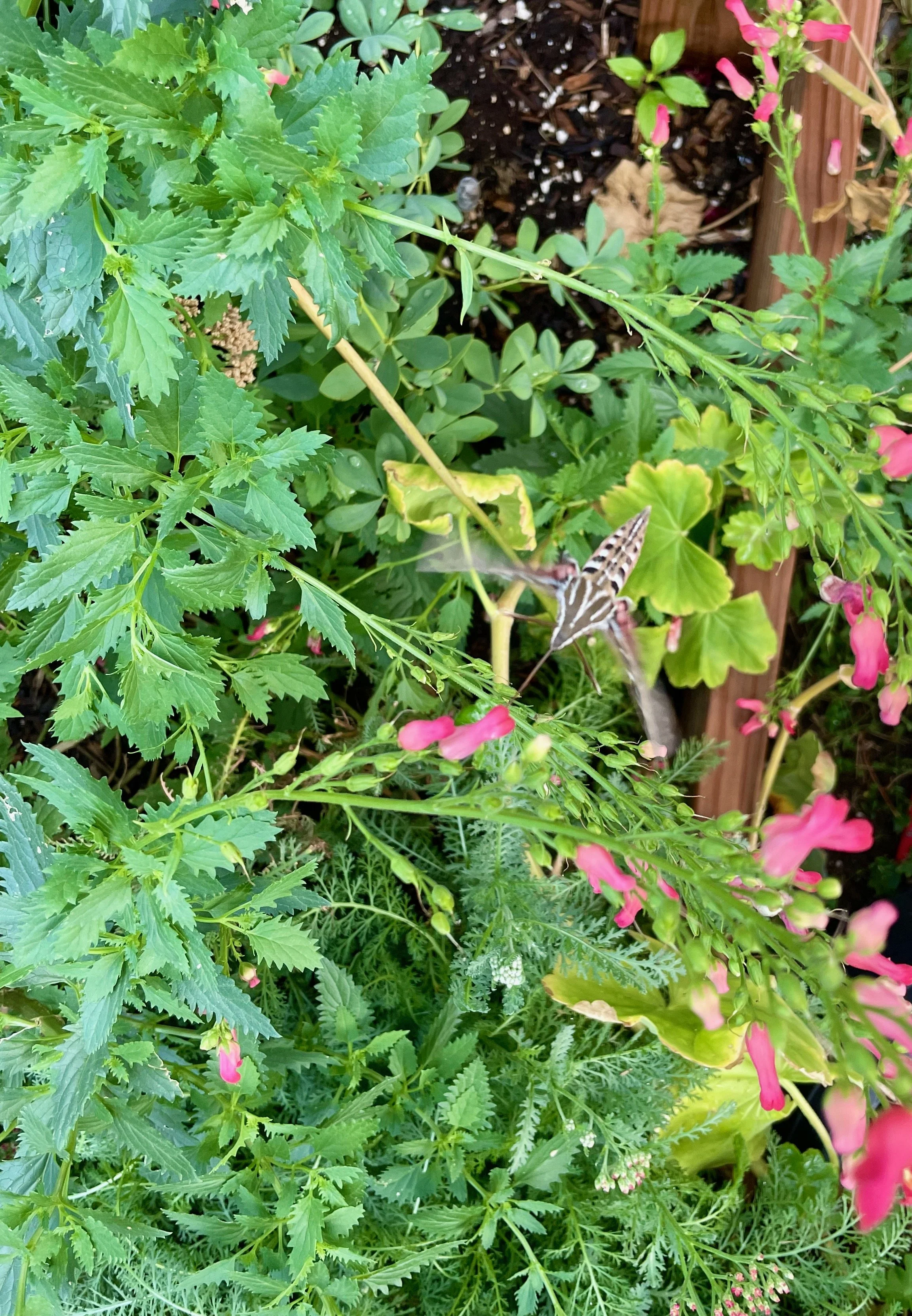 Hummingbirds and Hawkmoths seek out Red Birds in a Tree, so plant it where you can watch from a short distance. I often see both feasting in the evening together along with bumblebees and other insects. As a result, pairing Red Birds in a Tree with other plants that have similar flower shapes like Nicotiana, Monarda, Aquilegia, or Lobelia provides a banquet of diverse food sources for hummingbirds and insects that prefer tube-shaped flowers.