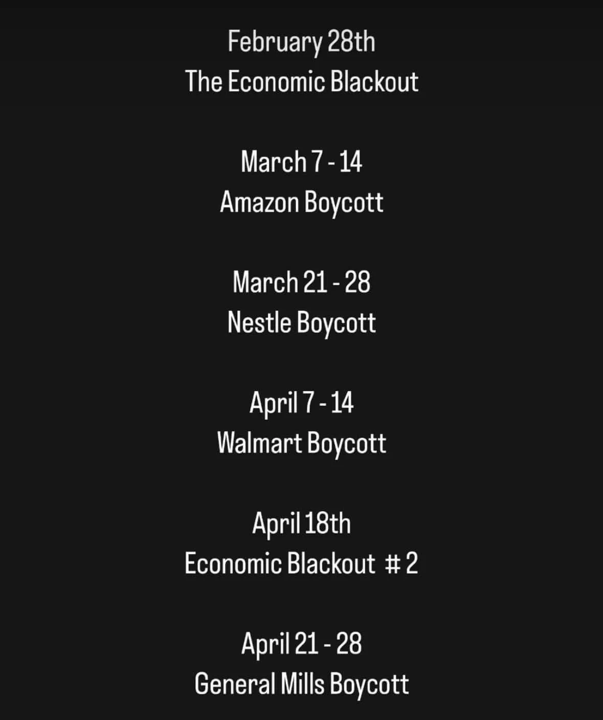 We will show our strength as a group by not spending money at all. No Zelle or Venmo. No online shopping. No food delivery. No movie rentals. No grocery shopping. Nothing. For 24 hours.