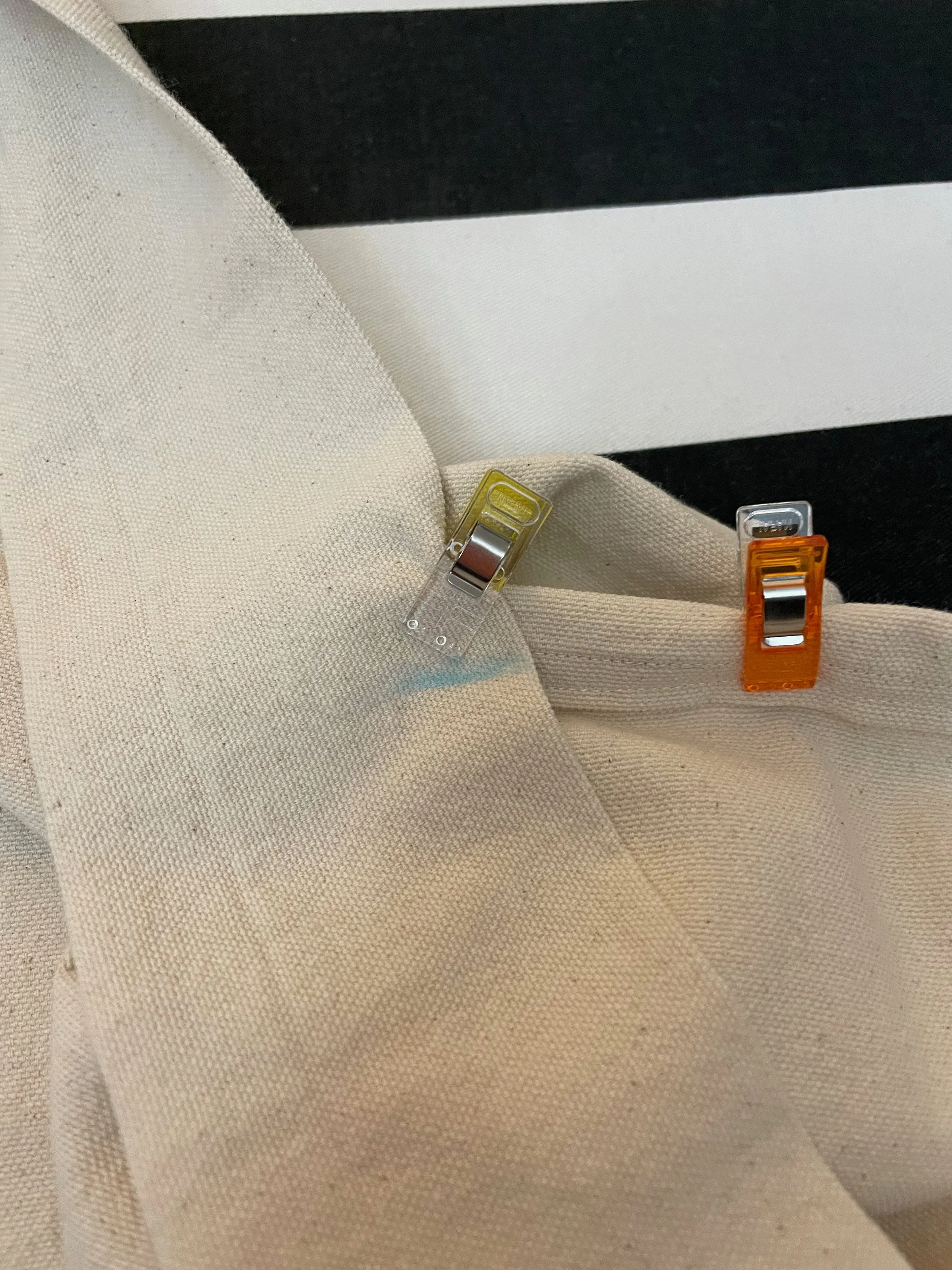 For pockets: mark the placement on one side. Then measure from the center fold to make it symmetrical on the other side. Pin into place.