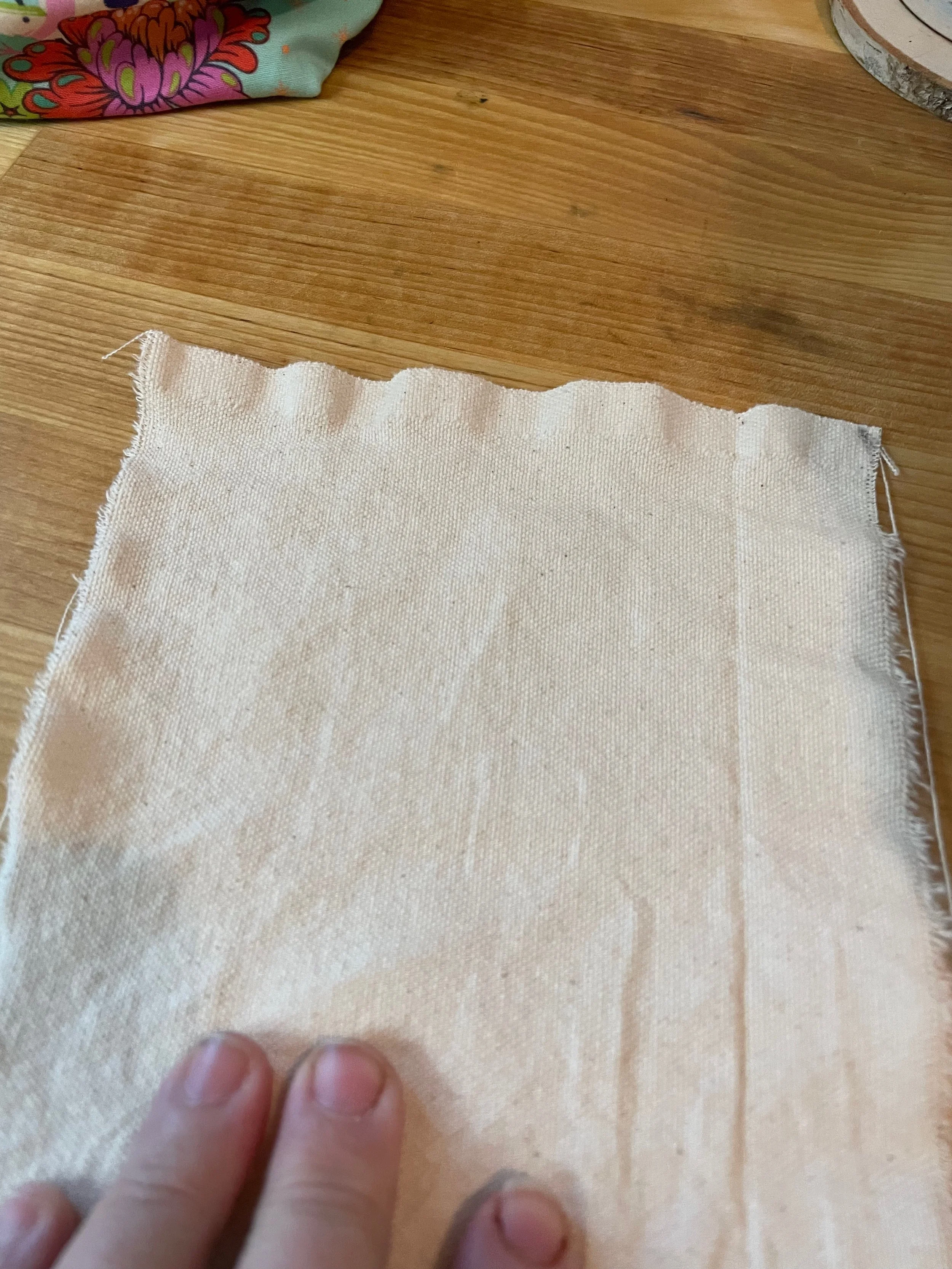 For two pockets, cut identical rectangles from the fabric. For a larger single pouch, trim to the desired size. Hem all sides of each pocket or pouch. I used a double hem to prevent fraying.